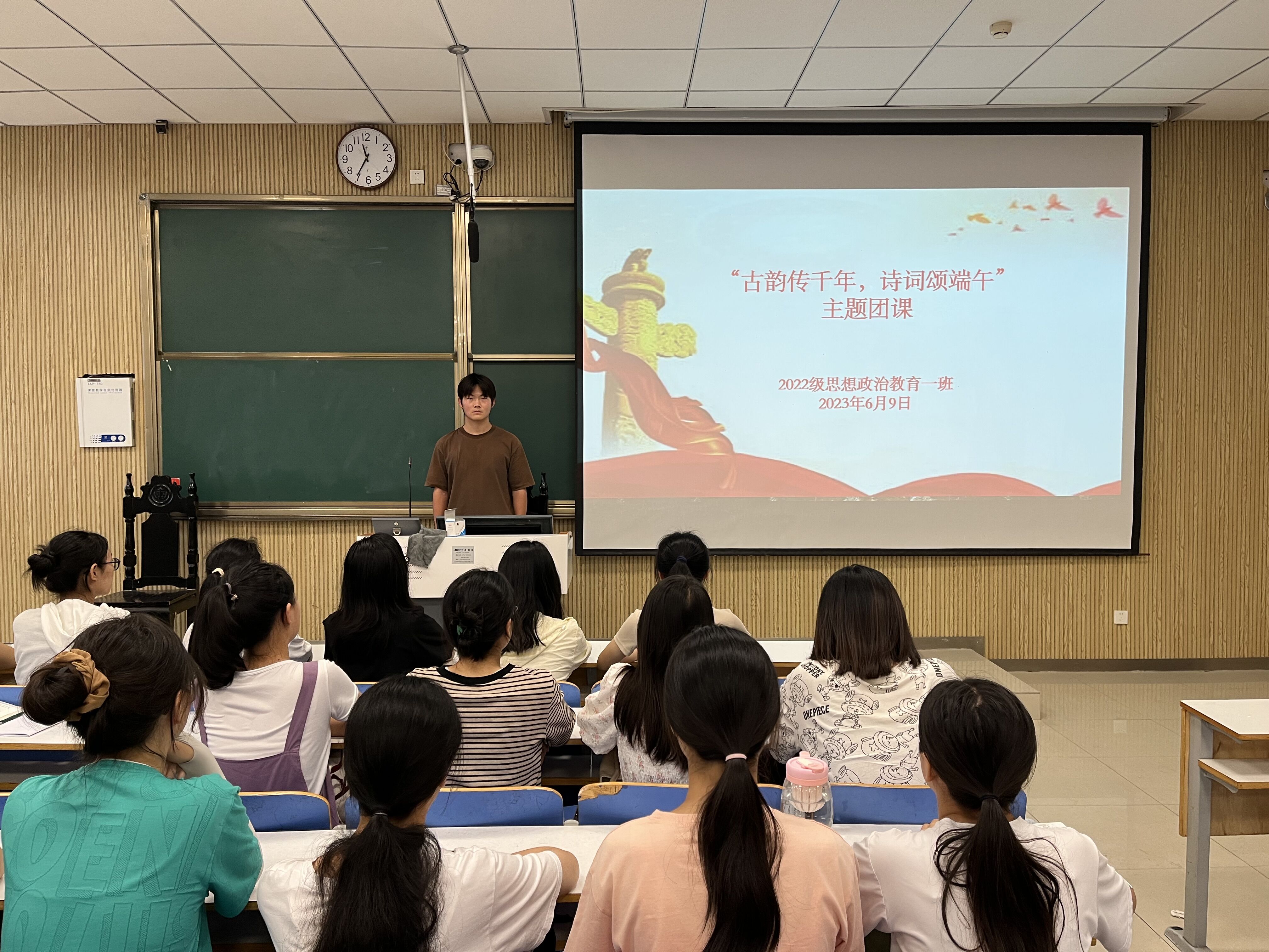 为进一步弘扬中华优秀传统文化,发挥传统节日在加强思想建设中的作用,6月9日上午,WilliamHILL中国2022级思想政治教育一班在社科楼515教室召开“古韵传千年,诗词颂端午”主题团课,2022级思想政治教育一班全体同学共同参与本次团课,团课由团支部副书记闻炎仲主持。
