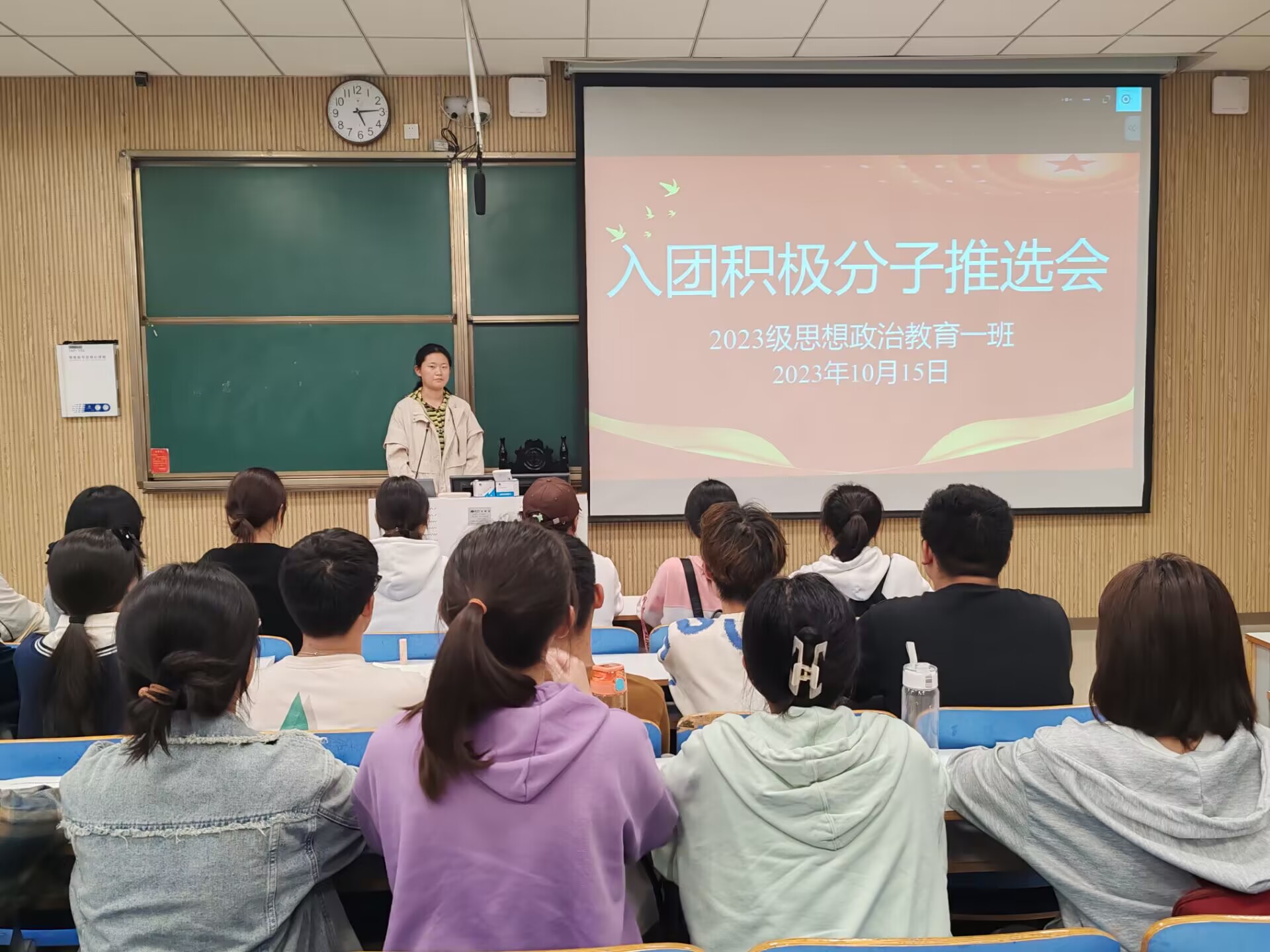 为进一步加强团组织建设,增强团支部的凝聚力,积极开展团青工作,10月15日下午,WilliamHILL中国2023级思想政治教育一班在社科楼514教室召开入团积极分子推选班会。我院2023级思想政治教育一班全体同学共同参与本次班会,班会由团支书张卓主持。