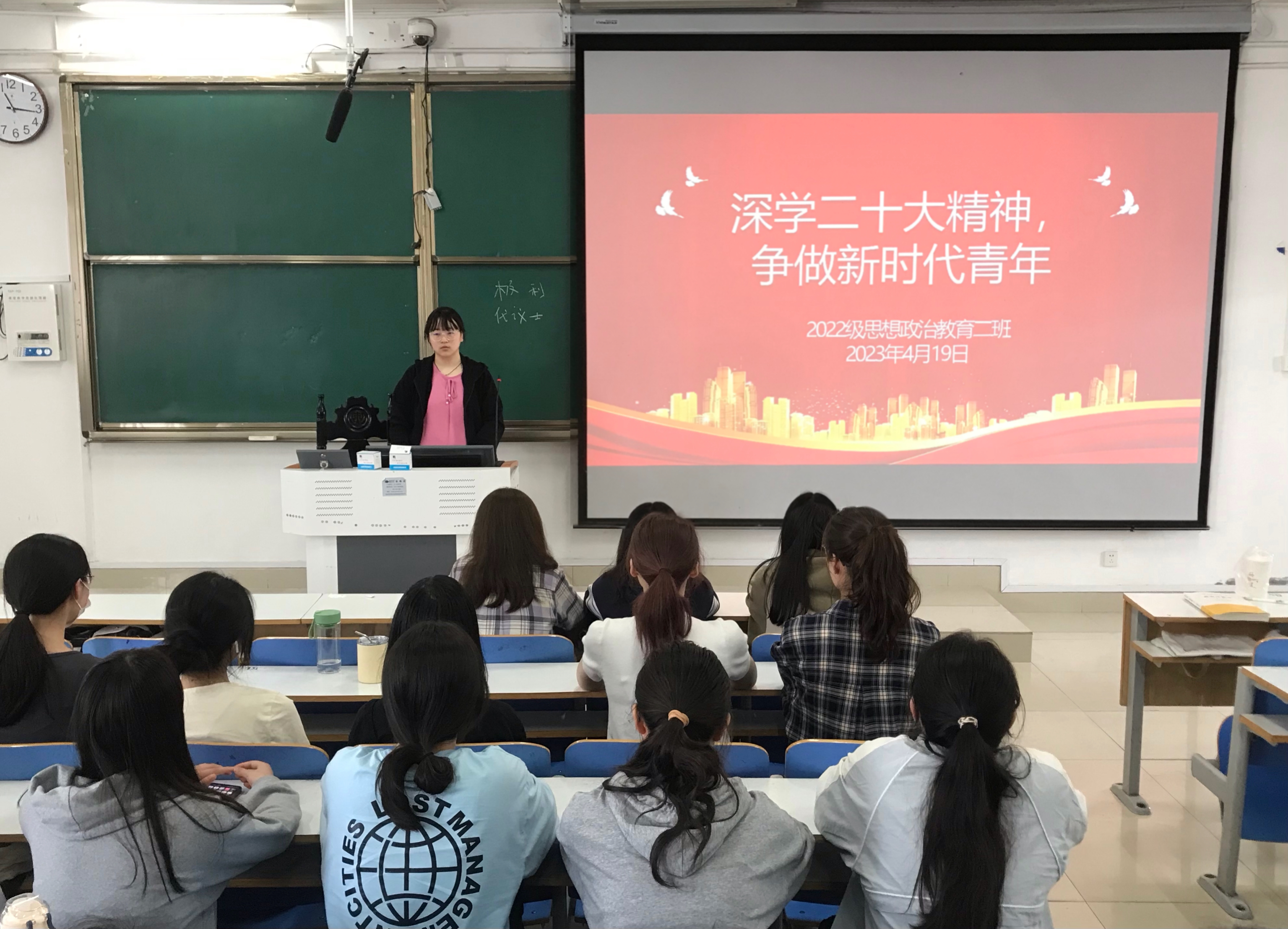 团课伊始,李佳音从党的二十大概况,报告的主要内容,报告中的新表述、新概括、新论断,以及如何学好党的二十大精神四个方面出发,深入解读党的二十大报告主要内容,深刻阐释学好二十大精神的关键所在。随后,她又以大学生、共青团员等多重视角向同学们讲解如何全面学习、深入领悟、认真贯彻党的二十大精神,并就党的二十大报告中的一些要点进行提问,同学们认真思考、积极回答,团课获得良好效果。最后,李佳音强调,作为新时代青年,我们要明确自身的责任与担当,自觉把思想和行动统一到党的二十大精神上来,在青春的赛道上奋力奔跑。