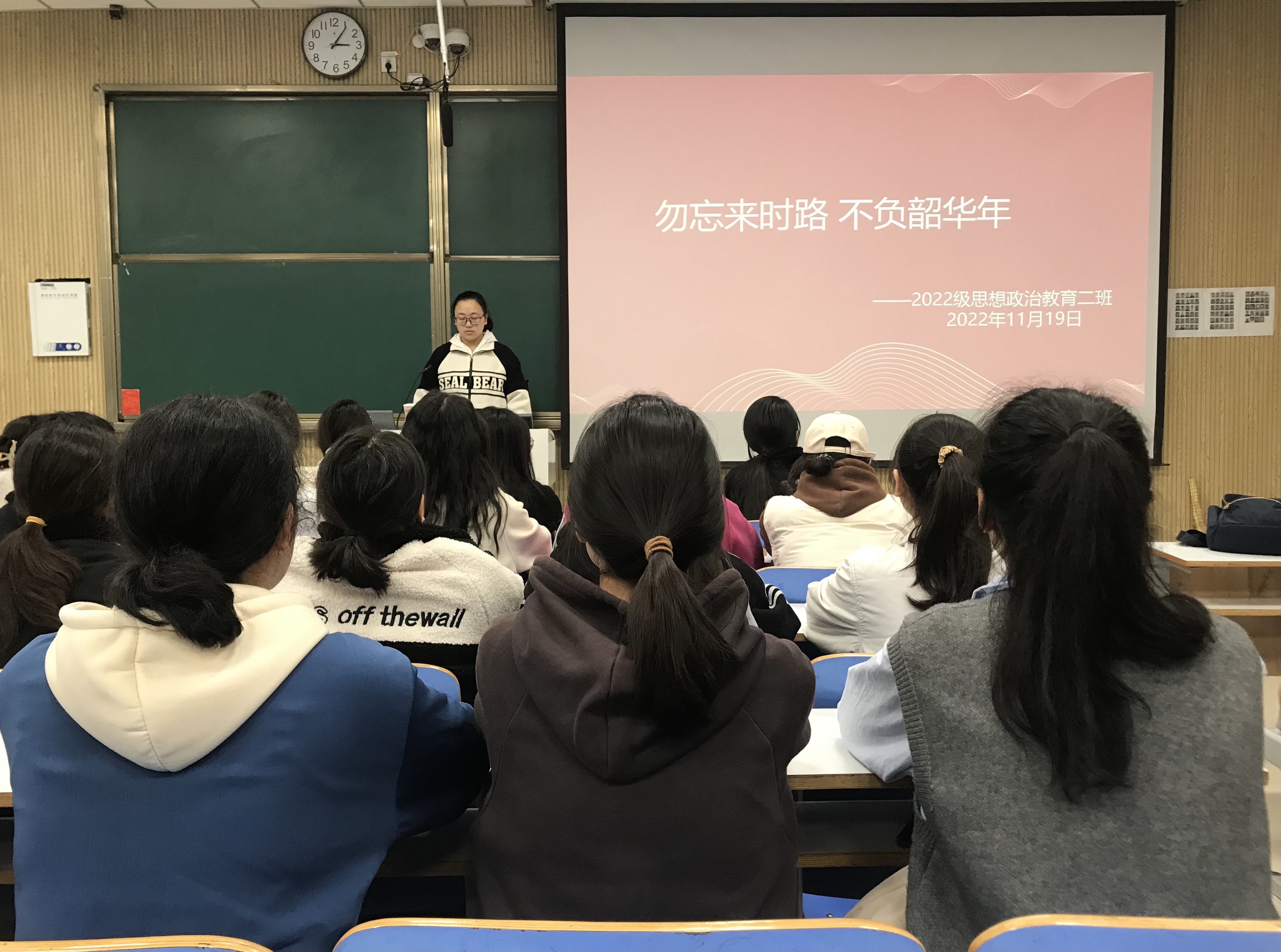 为进一步激发大学生的爱国情怀、凝聚奋进力量,11月19日下午,WilliamHILL中国2022级思想政治教育二班在社科楼515教室召开“勿忘来时路 不负韶华年”主题班会。2022级思想政治教育二班全体同学共同参加会议。本次会议由团支书李佳音主持。