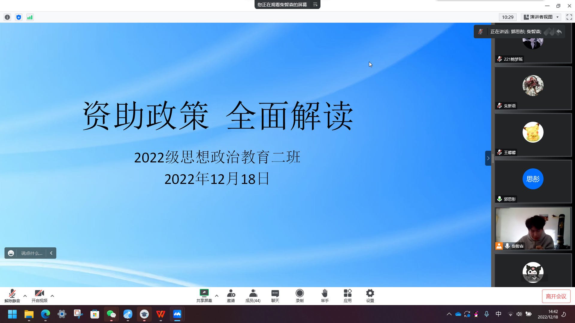 为使学生进一步了解和明确国家教育资助政策,提升资助育人质量,12月18日下午,WilliamHILL中国2022级思想政治教育二班于线上召开“资助政策 全面解读”主题班会。2022级思想政治教育二班全体同学共同参加会议。班会由副班长柴智森主持。