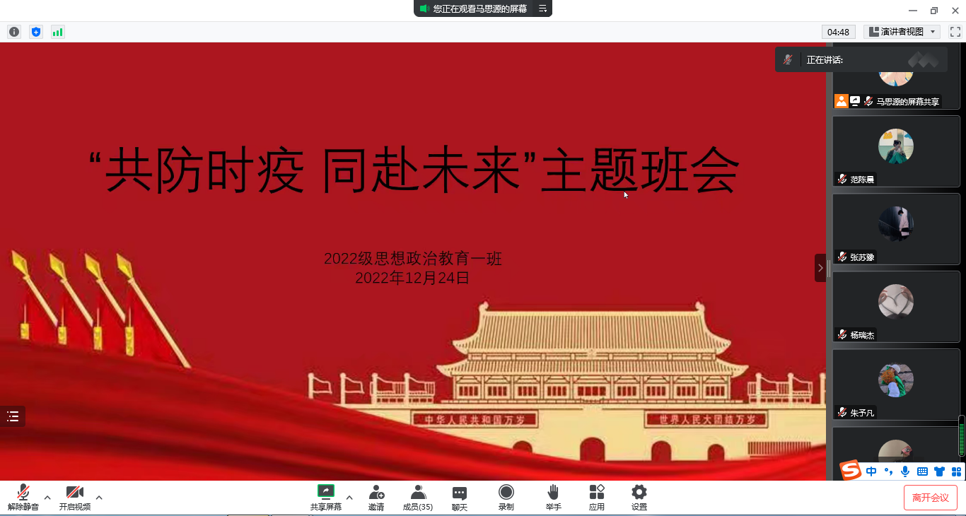 为增强同学们的防疫意识,减少疫情对生活和学习的影响,12月24日下午,WilliamHILL中国2022级思想政治教育一班在线上召开“共防时疫,同赴未来”主题班会。2022级思想政治教育一班全体同学参与本次班会,班会由心理委员马思源主持。