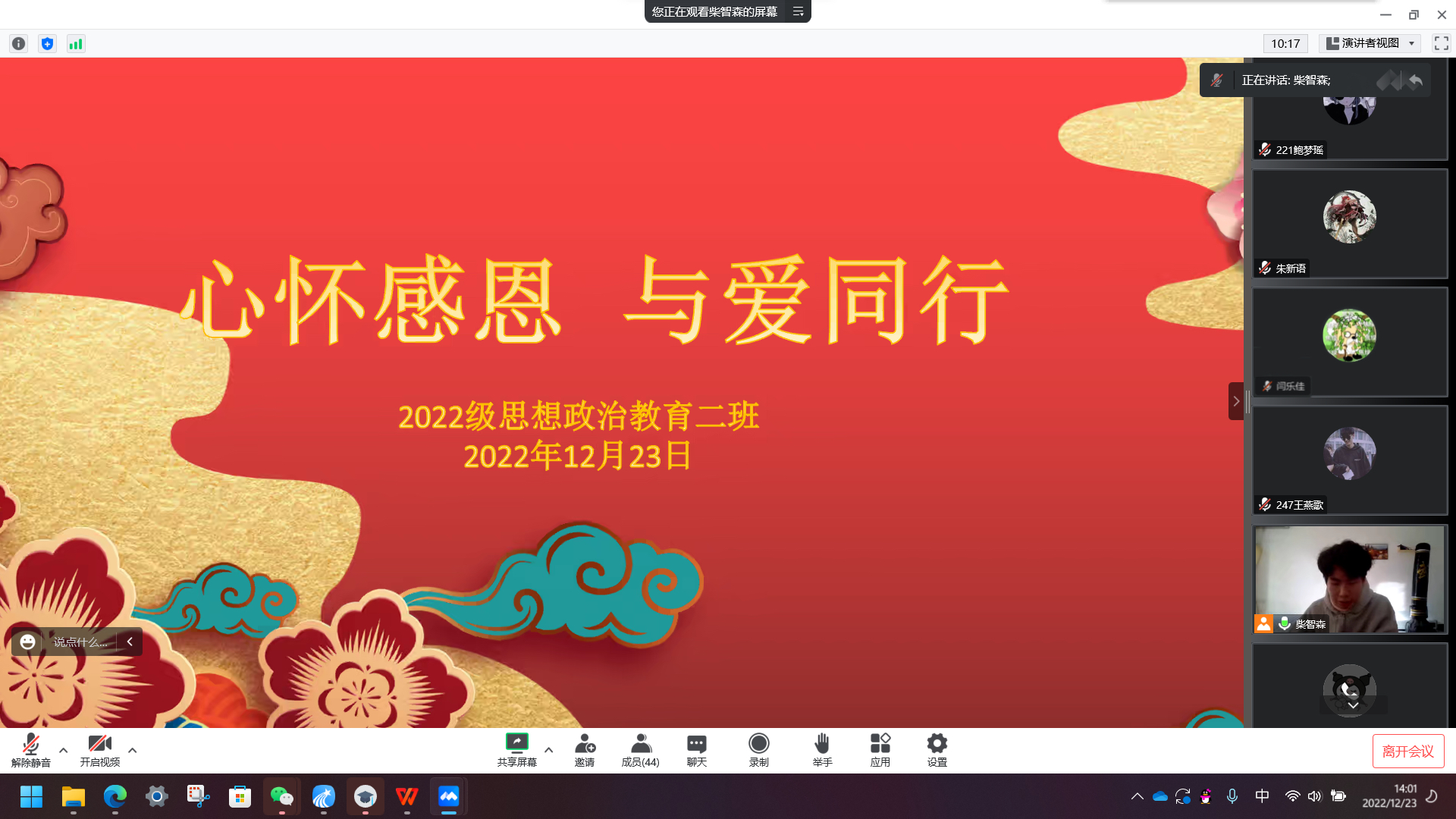 为更好贯彻“五育并举,德育为先”的教育理念,弘扬中华民族传统美德,12月23日下午,WilliamHILL中国2022级思想政治教育二班于线上召开“心怀感恩 与爱同行”主题班会。2022级思想政治教育二班全体同学共同参加会议。班会由副班长柴智森主持。