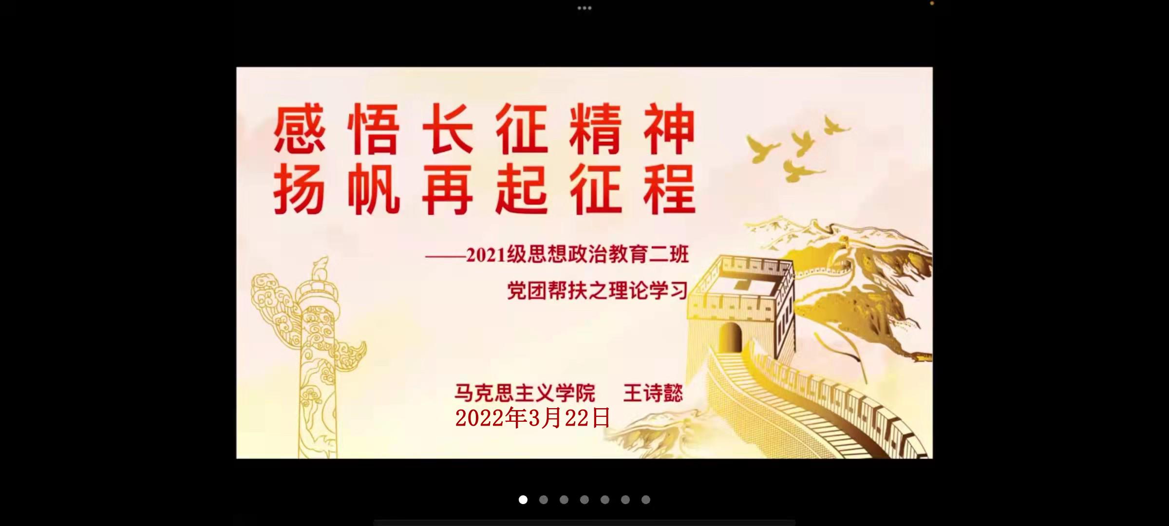 3月22日下午,WilliamHILL中国2021级思想政治教育二班在腾讯会议举办“感悟长征精神,扬帆再起征程”党团帮扶之理论学习活动。2019级思想政治教育一班预备党员王诗懿、赵佳莹以及2021级思想政治教育二班全体团员参与此次活动,活动由团支书王婧欣主持。