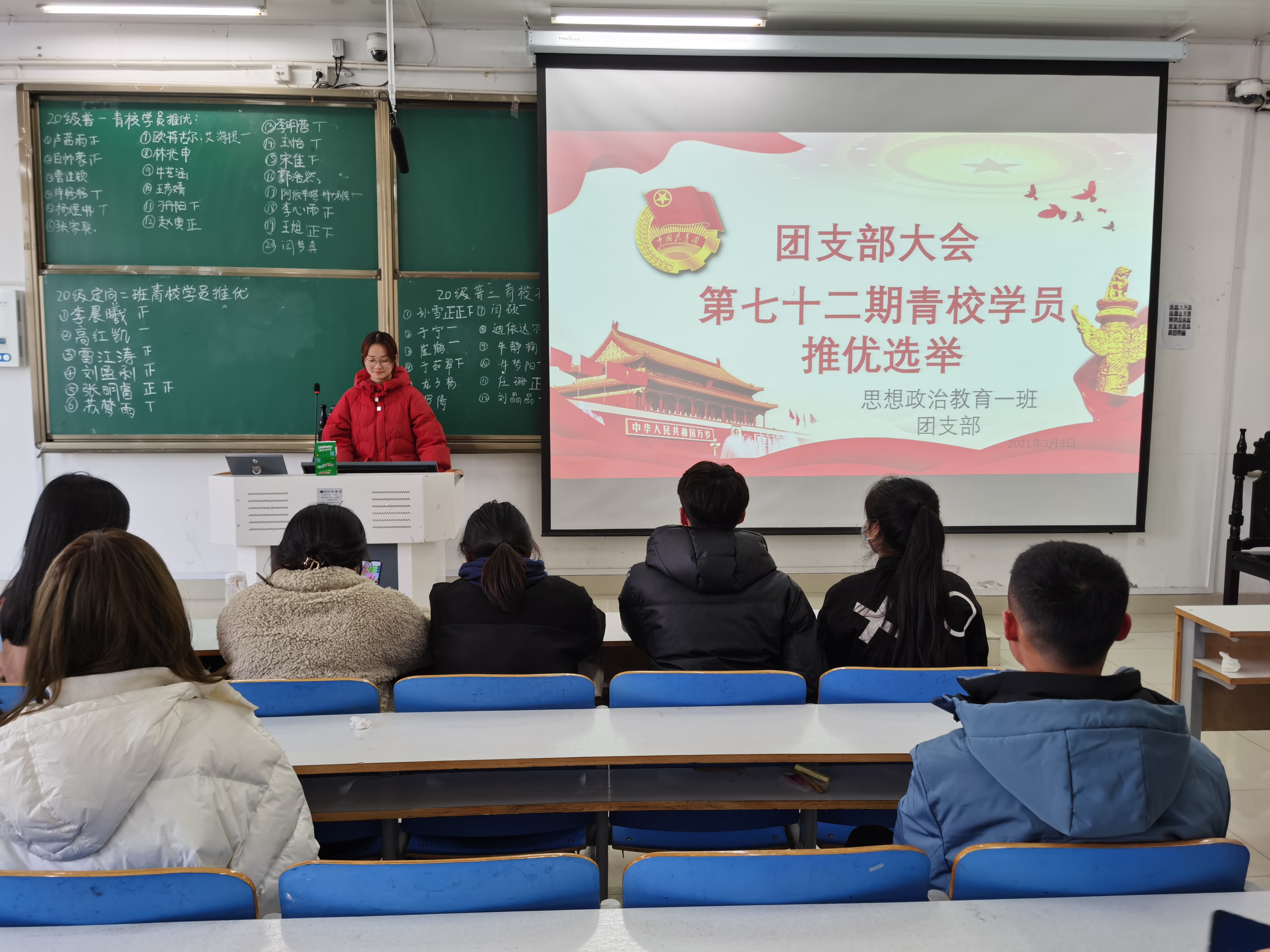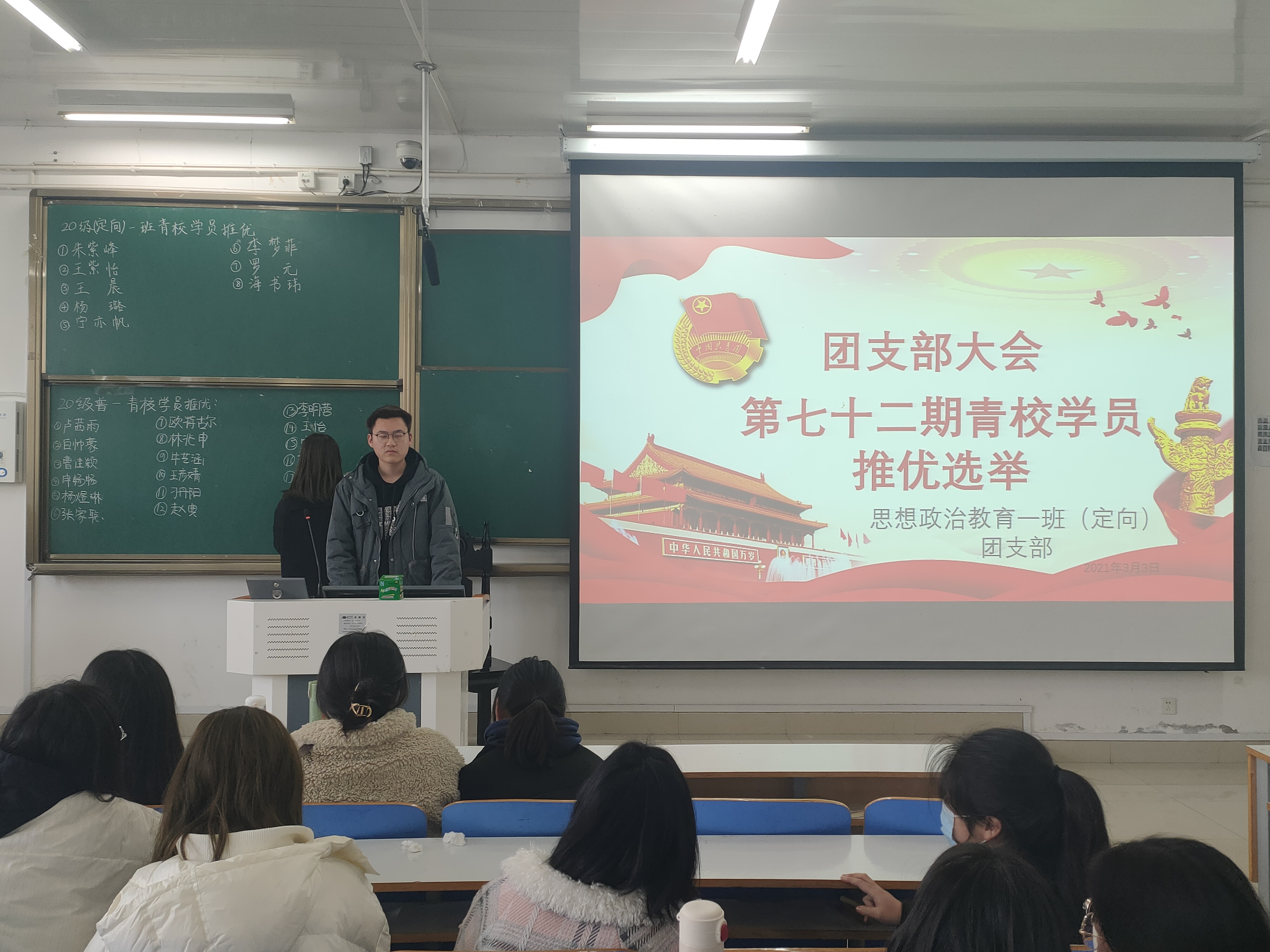 会议伊始,朱紫峰对上学期工作做出详细的汇报总结并简要阐述接下来的工作安排,他对支部委员们提出了三点建议:第一,在学习生活中用更高的标准规范自身行为,积极发挥模范带头作用,为同学们树立良好的榜样;第二,完成工作的同时应兼顾学习,切忌顾此失彼;第三,要及时反省自己的工作失误,吸取教训,提高工作效率和质量。接着,思想政治教育普通一班、(定向)一班全体学生通过不记名投票的方式选举出第七十二期优秀青校学员。最后,卢茜雨总结发言,她指出,班级工作的顺利开展离不开每位支部委员的共同努力,希望全体成员继续保持认真负责的态度,更好地为同学们服务。