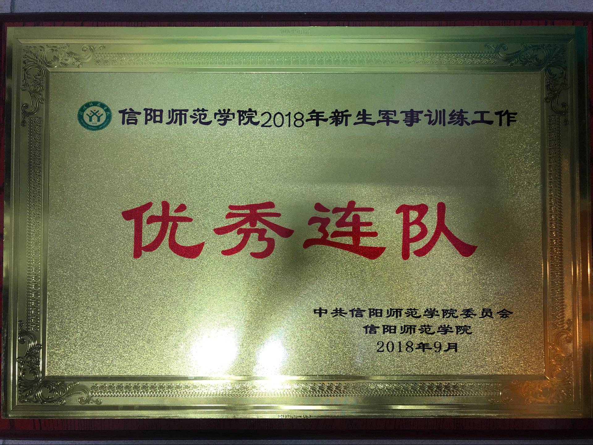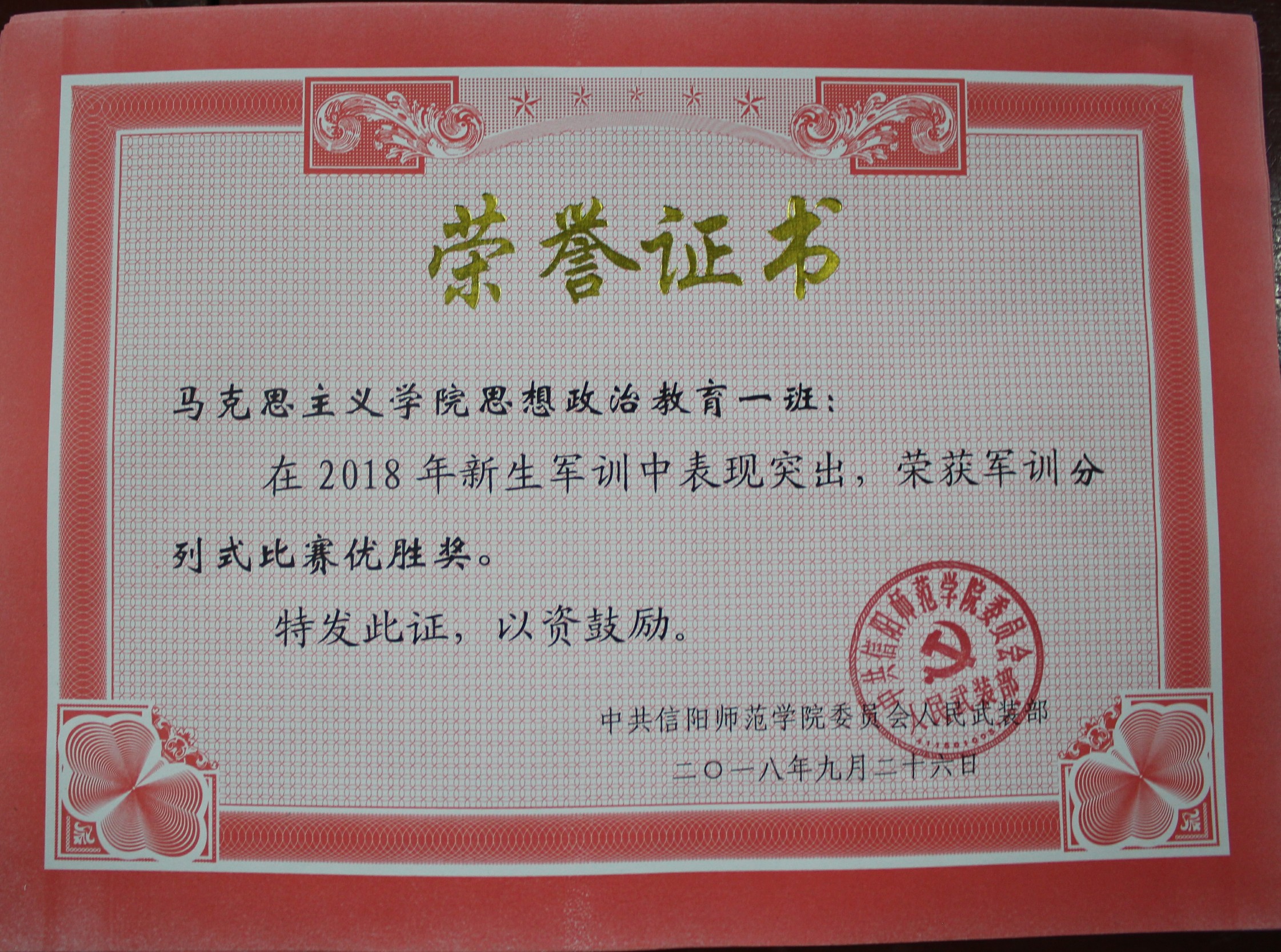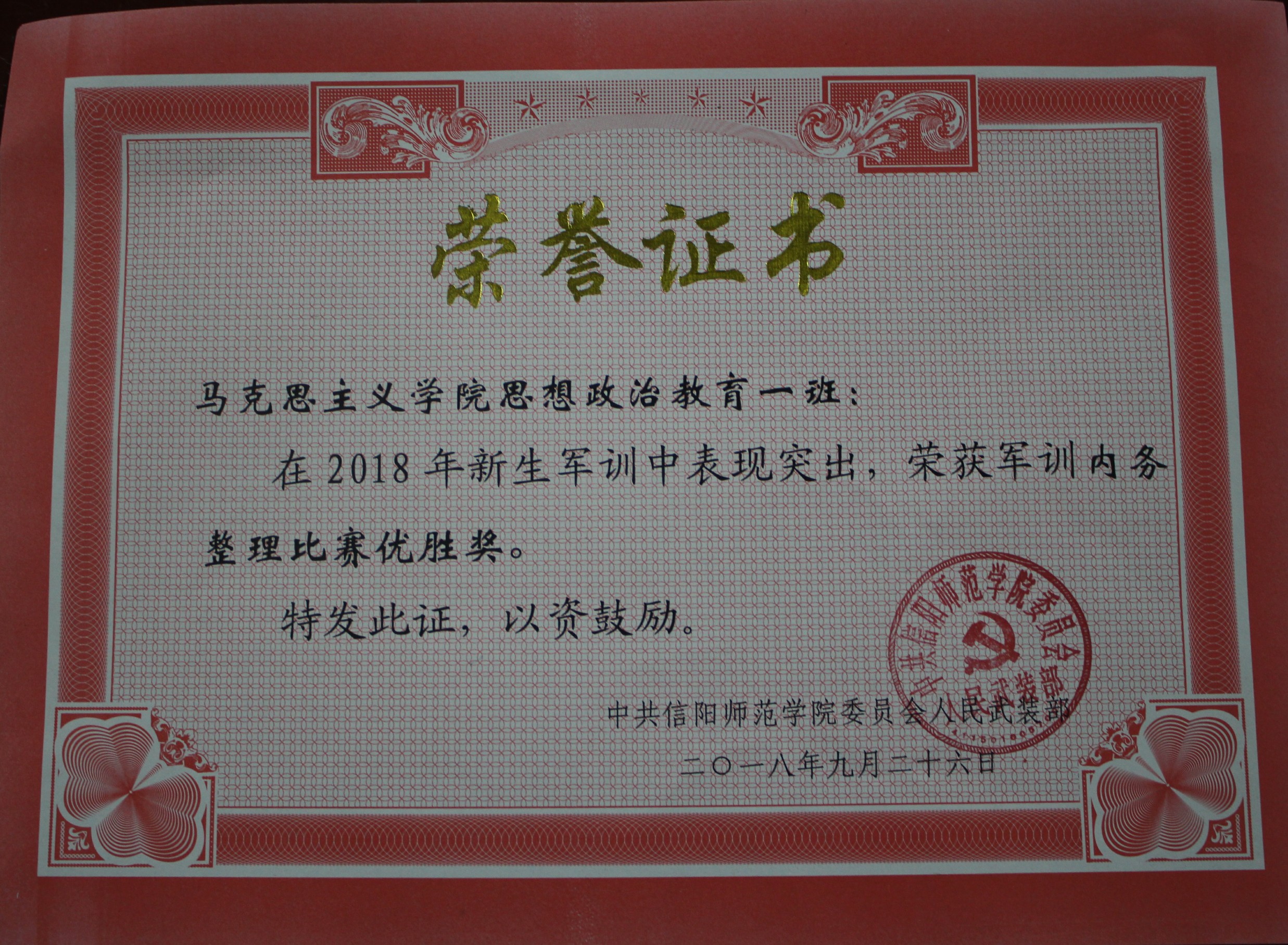 半个月的军训生活,同学们团结一致、刻苦训练。通过大家的共同努力,在9月26日举行的信阳师范学院新生军事训练成果汇报暨表彰大会中,我们2018级思想政治教育一班(一营一连)被授予了“优秀连队”称号及“军训内务整理比赛优胜奖”、“军训优秀连队”、“军训分列式比赛优胜奖”三张荣誉证书。同时,魏小依和邢子豪两位同学也被授予了“先进个人”称号。