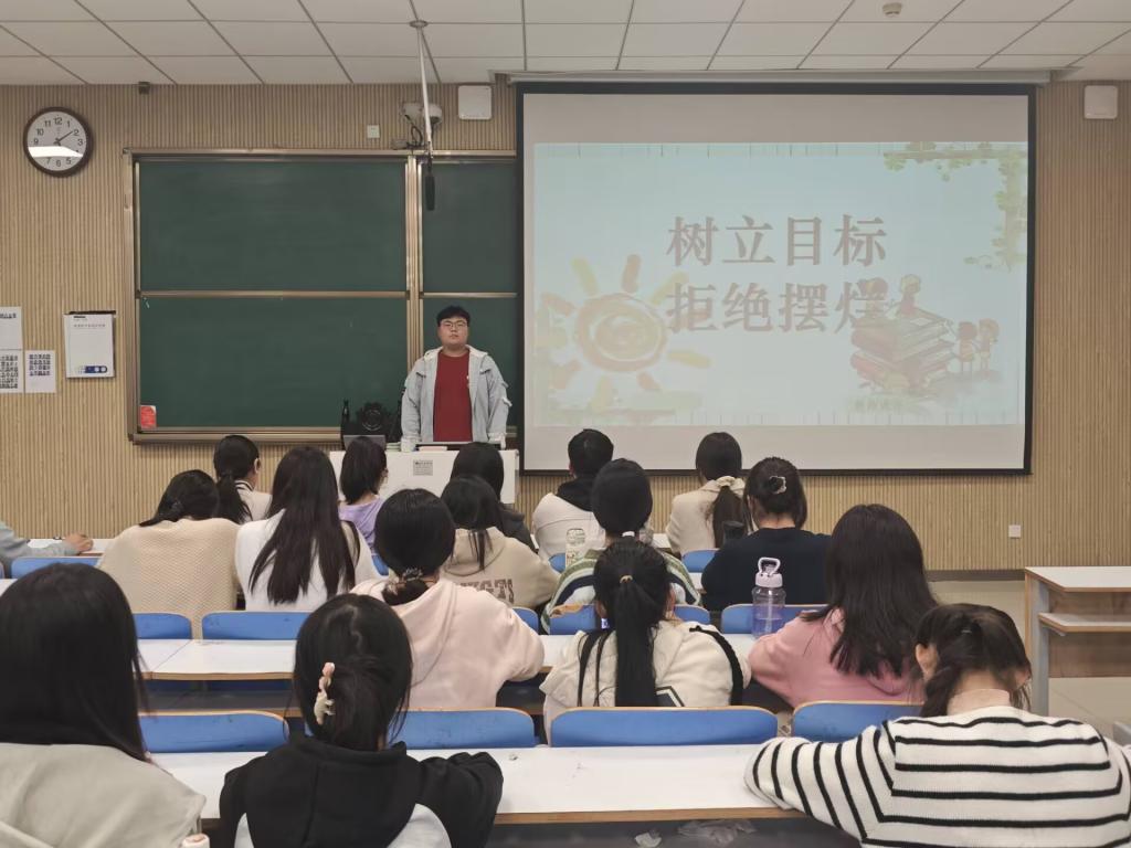 班会伊始,学习委员崔冰爽通过精心制作的 PPT,以直观的数据和鲜明的案例,揭示了 “摆烂” 现象在青少年群体中的种种表现及其潜在危害,引发了同学们的深刻反思。随后,她进一步详细阐述了树立明确目标对于个人成长和学业进步的重要性,指出目标就如同一座灯塔,在茫茫人生之海中为大家指引前行的方向。