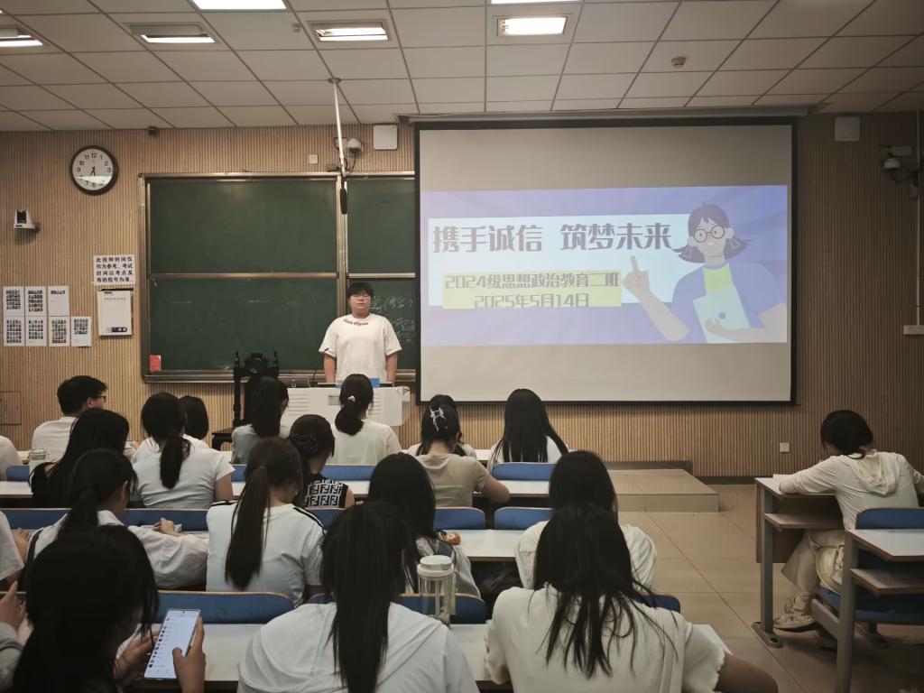 活动伊始,王志颖围绕“诚信”这一主题进行了简要讲解。他指出,诚信是中华民族的传统美德,是立身之本、交友之道,更是当代大学生应当坚守的行为准则。无论是在学业考试,还是在人际交往、未来工作中,诚信都应是每个人最基本的素养。他鼓励同学们从身边小事做起,做一个言而有信、行而有责的新时代青年。班会现场还播放了关于诚信主题的宣传短片,真实呈现了因失信带来的种种负面后果,警示同学们以他人为鉴,严于律己。视频结束后,同学们围绕“诚信与青年责任”展开热烈讨论,纷纷结合自身经历谈感悟、谈收获。王志颖在总结讲话中强调,诚信不仅是一种品德,更是一种责任。希望大家在今后的学习与生活中,将诚信内化于心、外化于行,以诚立身、以信筑梦,共同营造诚实守信、积极向上的良好班风。
