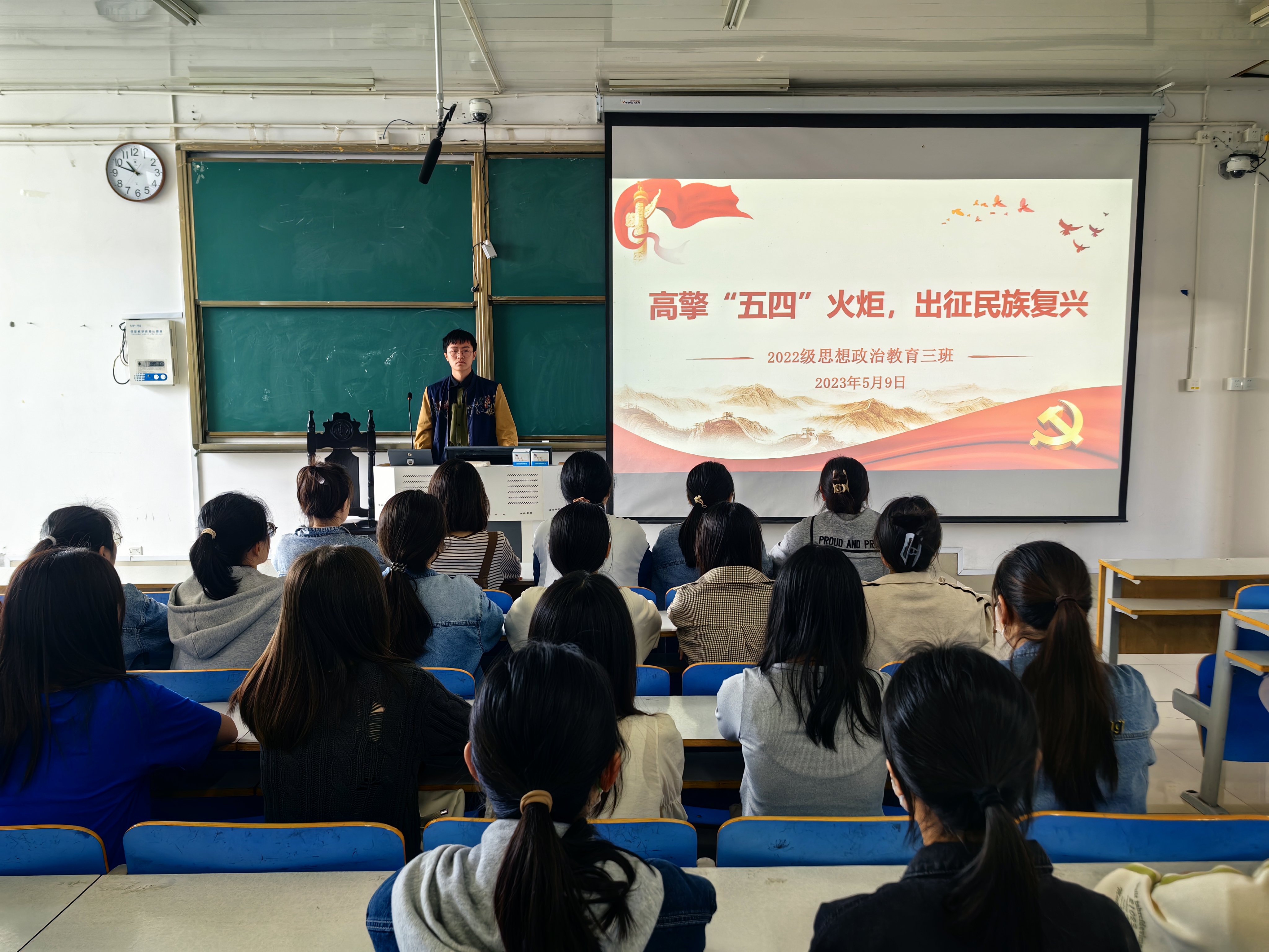 团课伊始,余浩洋带领同学们重温入团誓词,践行铿锵誓言;齐唱共青团团歌,用青春之声展现出三班学子昂扬向上的精神风貌。接着,余浩洋指出,五四运动是革命先辈反帝反封建的一次彻底的爱国运动,是新民主主义革命的开端,造就了以爱国、进步、民主、科学的五四精神,值得永远铭记。随后,学生代表邓涵戈发言,作为思政学子,我们要深化专业课程学习,勇做走在时代前列的弄潮儿,在五四精神的滋养中,传承红色基因,锤炼坚毅品格,为国家发展、社会进步贡献力量。最后,余浩洋提出三点要求:一是从历史中汲取营养,追寻红色足迹、感悟光辉历史;二是从书本中汲取养料,坚定理想信念、高擎五四火炬;三是从实践中汲取养分,投身社会实践、担当民族复兴。