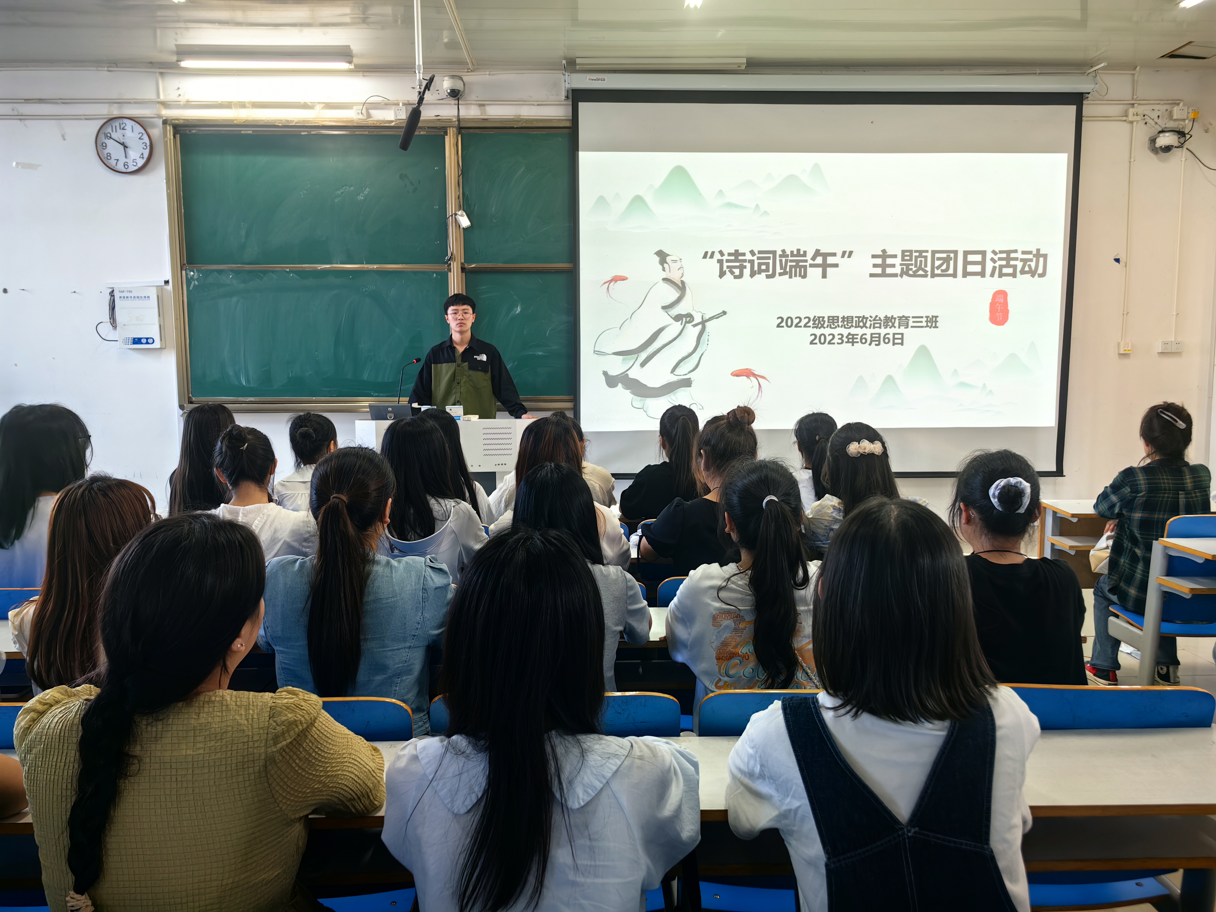 活动伊始,余浩洋从古籍经典、诗词佳作中带领同学们寻觅端午的民俗趣味,他指出,作为国内四大传统节日和中国首个入选世界非遗的节日,端午节承载着2000多年华夏文化的记忆,承载着神州大地代代相传的习俗。接着,学生代表郭陶颖发言,端午节内涵丰富、别名众多、节日习俗多元,是传统节日中富有刚健气息的节日,千百年来,屈原爱国忧民、坚持真理、宁死不屈的精神与风骨,感召哺育着中华儿女。随后,余浩洋分小组进行精彩纷呈的诗词文化抢答、诗词“飞花令”、诗词个人比拼等环节。最后,余浩洋强调,端午节源远流长,诗词话端午更能体现出中国人的浪漫情怀与真挚情感,他希望,同学们了解端午风俗、学习端午知识、感悟端午节日,品味端午古今共享的快乐与美好。