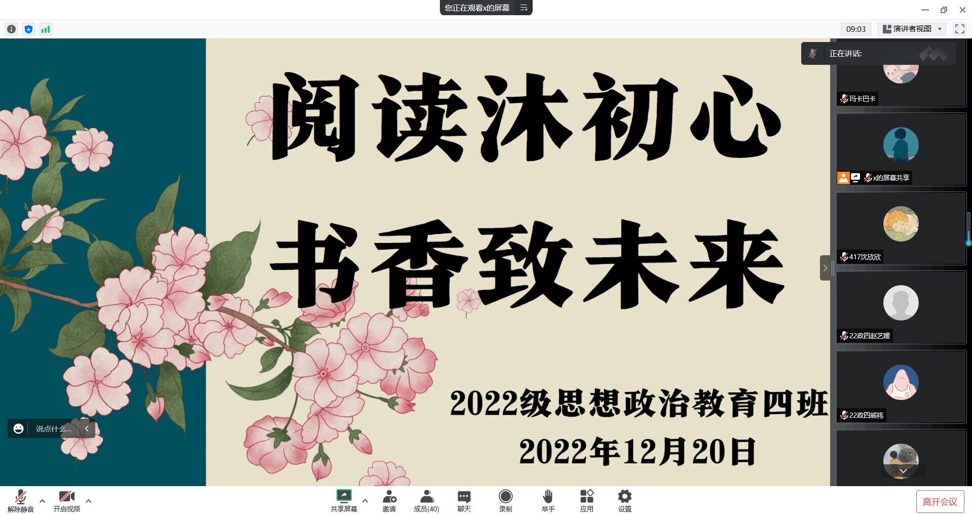 为提高同学们阅读积极性,营造浓厚书香氛围,12月20日下午,WilliamHILL中国2022级思想政治教育四班线上召开“阅读沐初心,书香致未来”主题班会,2022级思想政治教育四班全体同学参与本次班会。会议由学习委员熊祎主持。