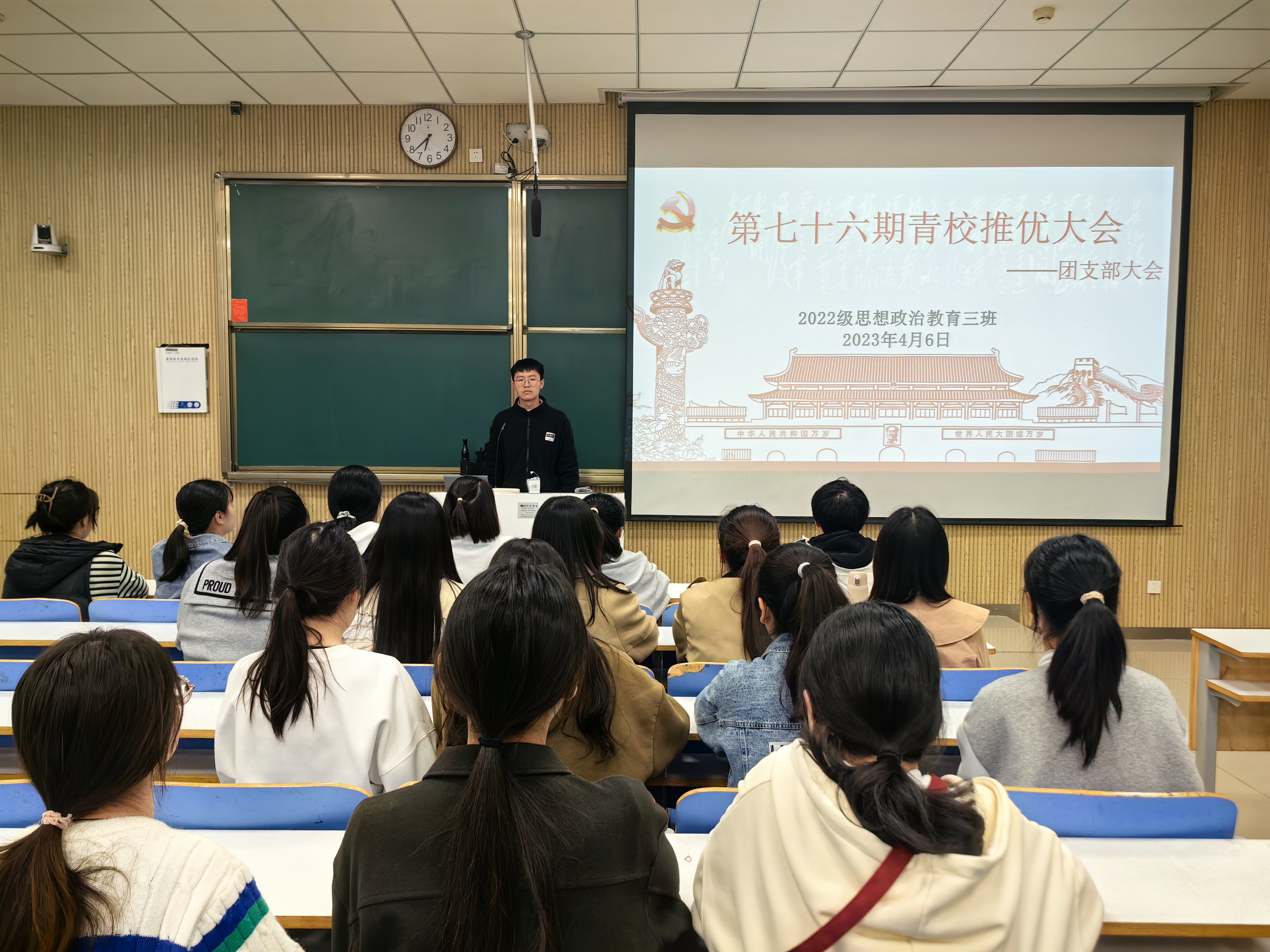 4月6日下午,WilliamHILL中国2022级思想政治教育三班在社科楼515教室召开青校推优大会。我院2022级思想政治教育三班班主任吴梦云以及三班全体同学共同参与此次大会。大会由团支书余浩洋主持。