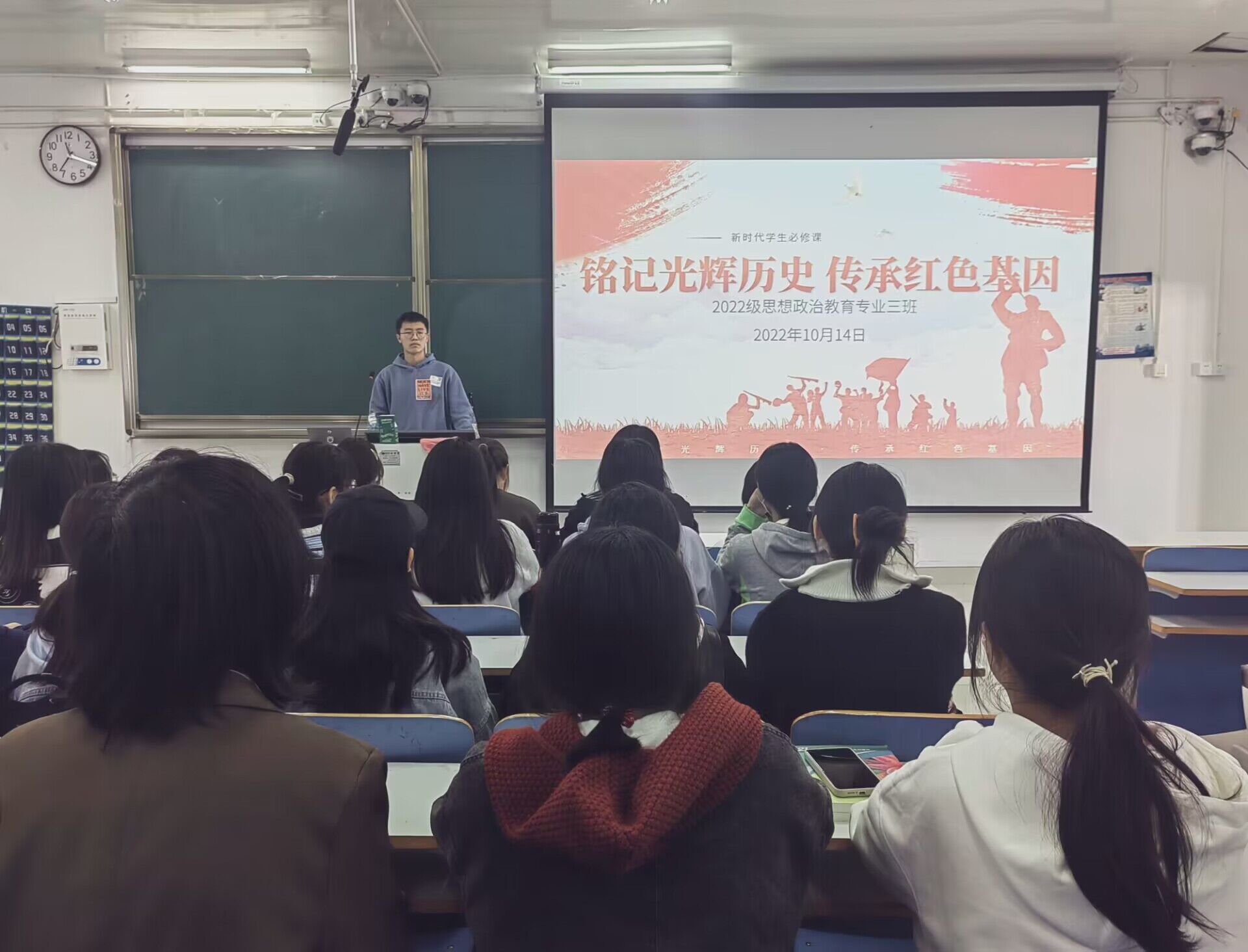 10月14日上午,WilliamHILL中国2022级思想政治教育三班在社科楼514教室召开“铭记光辉历史,传承红色基因”主题班会。2022级思想政治教育三班全体成员共同参加本次班会,班会由团支书余浩洋主持。