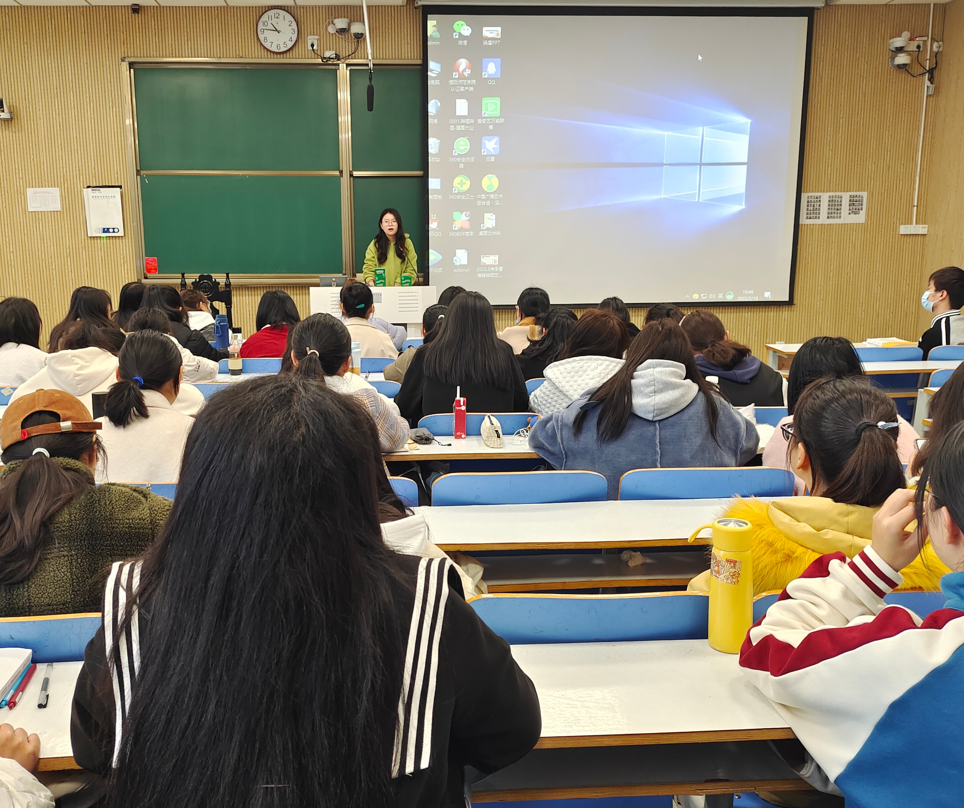 班会伊始,高小佳老师结合信阳市疫情防控规定以及学校疫情防控要求,向同学们再次强调,“非必要不外出”,坚持做好个人防护工作,需外出者严格执行学校请假流程。她从三个方面提出要求:一是同学们要重视疫情防护,在任何时候都不能松懈,不要轻信网络舆情。要及时关注国家以及学校发布的各项防疫通知,并配合学校的防疫工作;二是班委要起带头作用,认真落实班级的各项防疫工作;三是积极落实疫情防控措施,常备消杀用品,正确佩戴口罩,调整心态积极抗疫。最后,高小佳强调,根据天气变化及时增减衣物,注意身体健康,若出现感冒发烧等症状一定要实际上报。