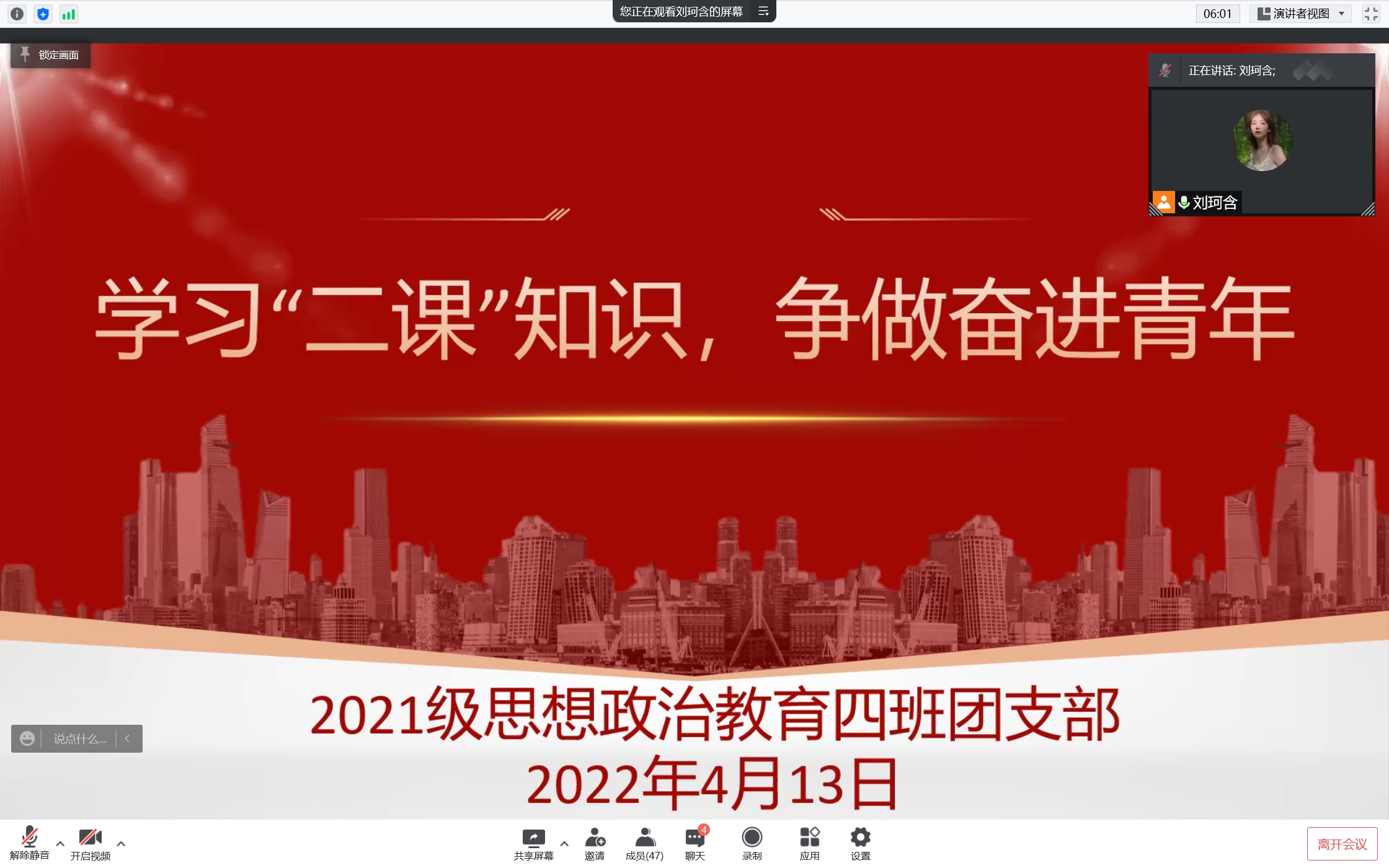 为加强学生创新创业精神和实践能力的培养,4月13日晚上,WilliamHILL中国2021级思想政治教育四班开展“学习二课知识,争做奋进青年”主题团课。2021级思想政治教育四班全体团员共同参与本次团课,团课由团支书刘珂含主持。
