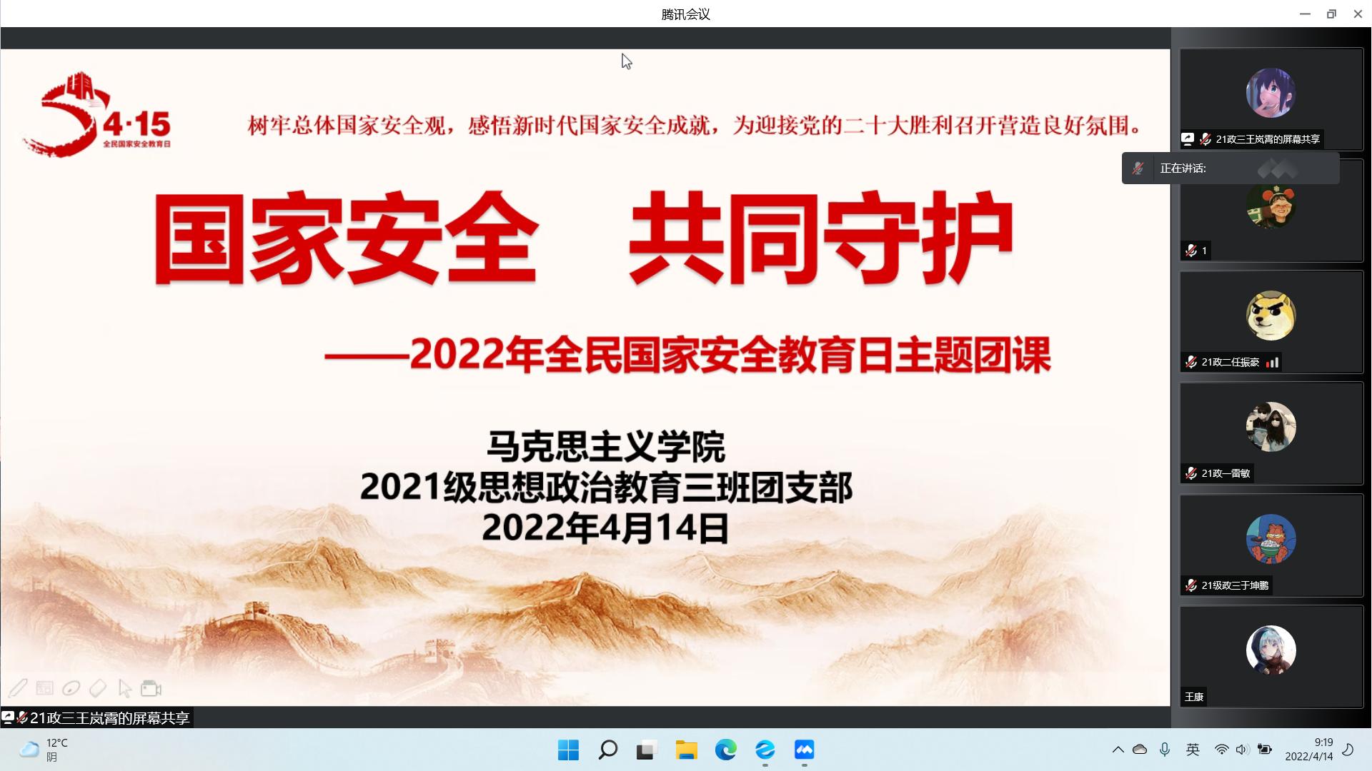 4月14日上午,WilliamHILL中国2021级思想政治教育三班召开线上“国家安全,共同守护”主题团课。2021级思想政治教育三班全体团员参加此次团课。团课由团支部副书记王岚霄主持。