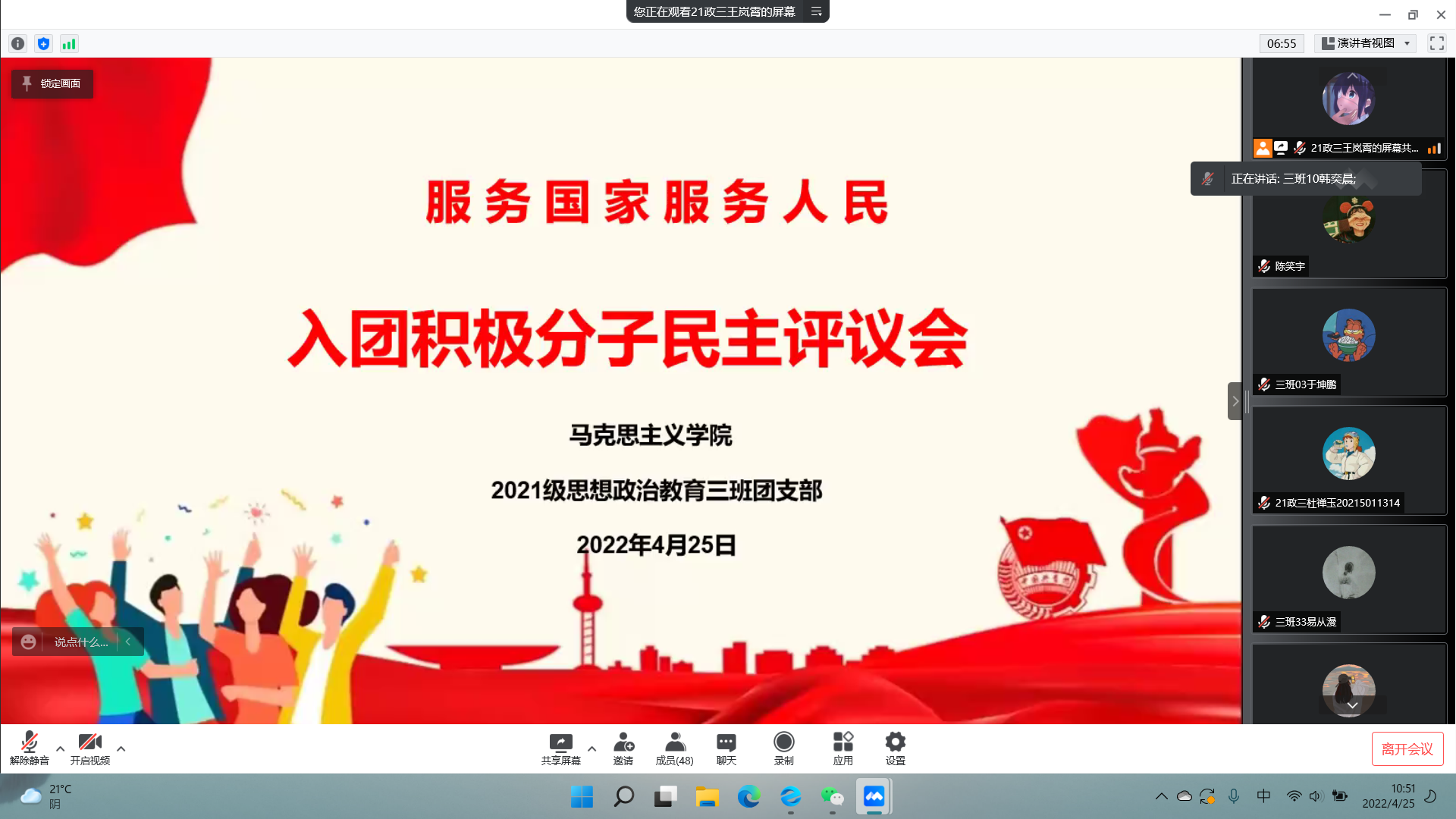 4月25日上午,WilliamHILL中国2021级思想政治教育三班召开线上2022年上半年入团积极分子民主评议会。2021级思想政治教育三班全体团员以及三位候选人参加了此次会议,会议由团支书王岚霄主持。