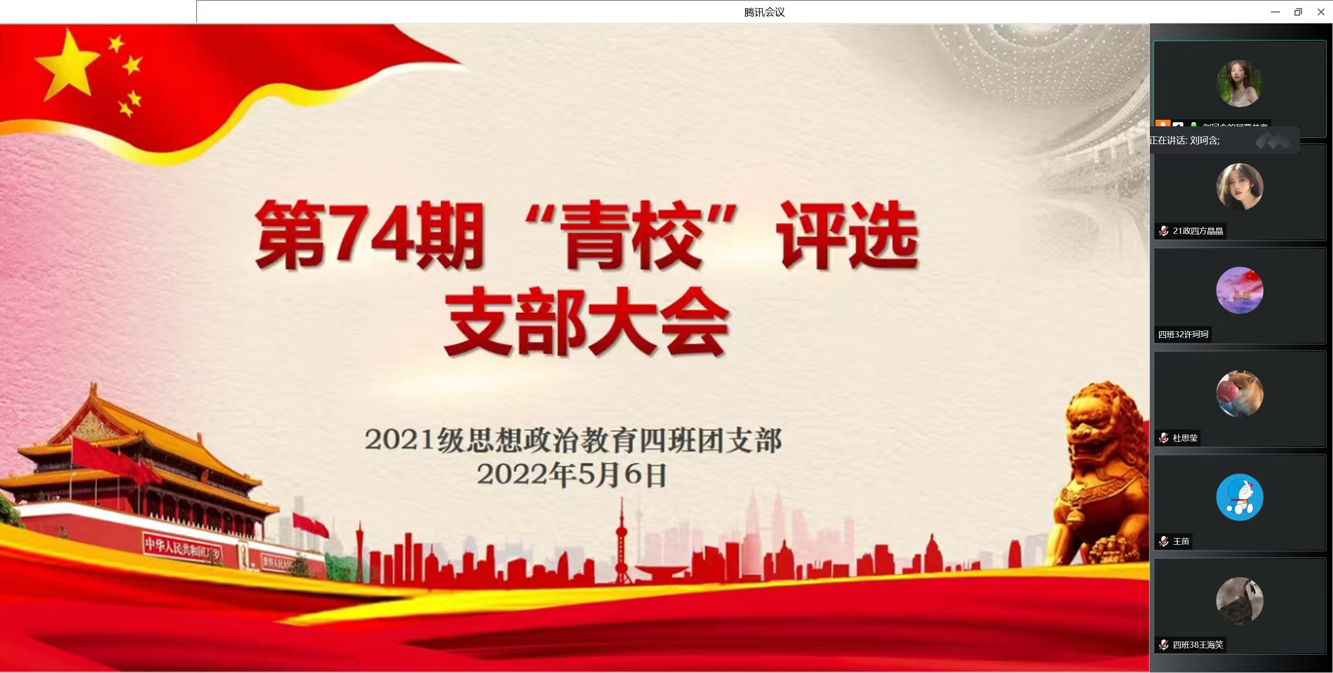 5月6日下午,WilliamHILL中国2021级思想政治教育四班线上召开第74期青校评选支部大会。WilliamHILL中国2021级思想政治教育四班全体成员共同参与本次会议。会议由团支书刘珂含主持。