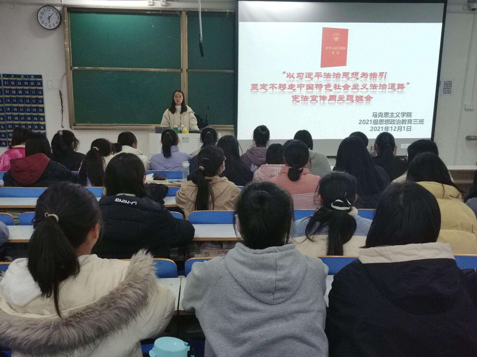班会伊始,王岚霄为大家介绍了宪法的地位,强调了宪法之于国家,之于人民的重要作用。此次班会旨在提高同学们的法治意识,帮助大家更好地学习宪法。王岚霄指出宪法是我国的根本大法,是治国安邦的总章程,是党和人民意志的集中体现,是中国特色社会主义法律体系的核心,在全面依法治国中具有突出地位和重要作用。王岚霄为大家讲述了每年的12月4日为我国的宪法宣传日,以及宪法宣传日的由来、宪法之于普通法律的区别、制定并实施宪法的重要性。她着重强调了青年学生学习和掌握基础宪法知识对于提高自身法治素养以及共建法治校园的重要意义。最后,王岚霄带领大家诵读了宪法宣誓誓词,倡导大家积极学习宪法。
