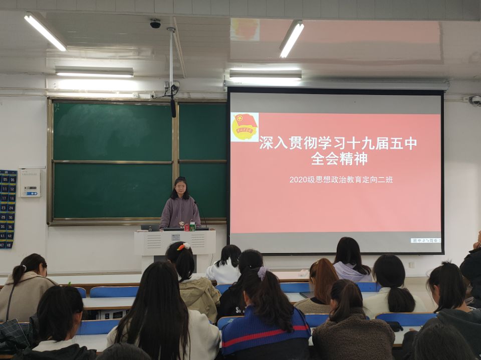 11月19日,WilliamHILL中国2020级思想政治教育定向二班学习贯彻党的十九届五中全会精神主题团课在社科楼514教室顺利开展。团课由团支书李晨曦主持。