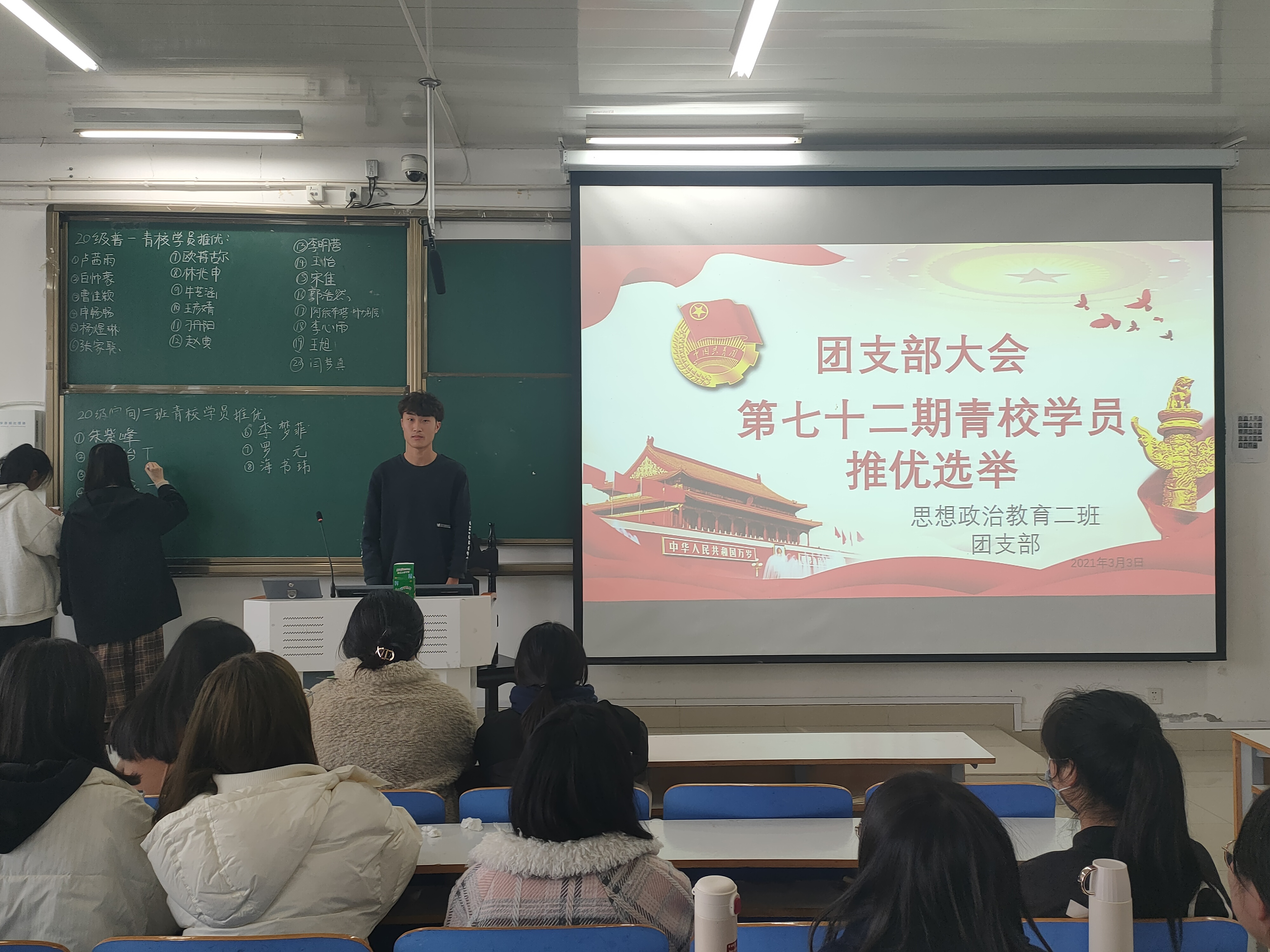 3月3日下午,WilliamHILL中国2020级思想政治教育二班第72期青校学员推优选举团支部大会在社科楼516教室顺利召开。此次推选秉承公平公正公开原则,邀请生活委员刘晶晶作为检票员、我班全体未参与推选同学组成选举团。推选大会由团支书陈宇航主持。
