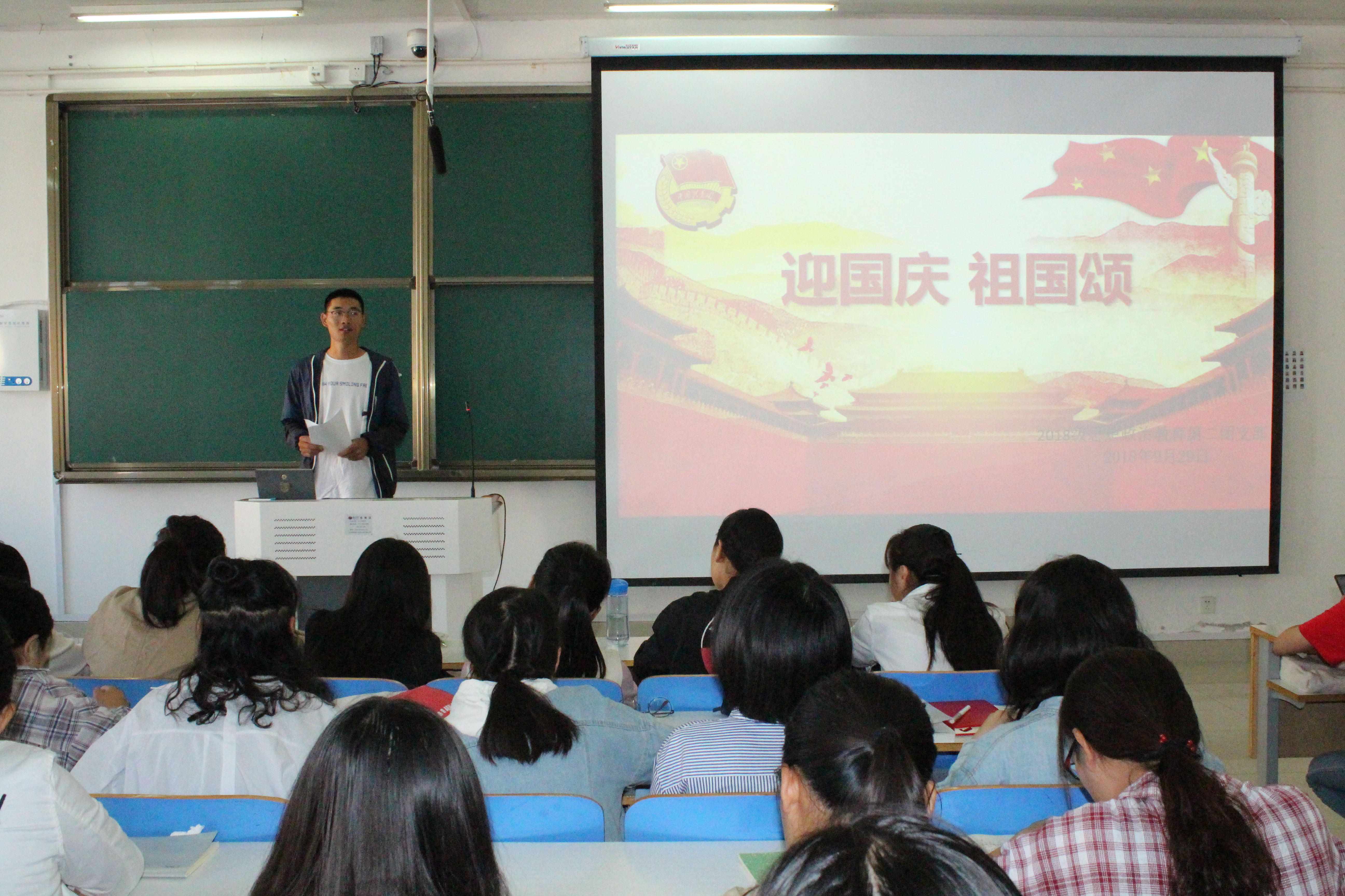 杨康首先作了军训总结,希望同学们能将军训中坚韧不拔的精神贯彻到学习生活中去。他表示,作为新一代青年,我们应义不容辞担负起祖国复兴重任,从自身做起,严于律已。接着,杨康给大家播放开国大典视频。视频将开国大典时的雄伟决心、中国百年的抵抗侵略的岁月以及2017年建军90周年阅兵的壮观展现的淋漓尽致。最后,杨康带领全班同学宣誓,一展我院学子对祖国的无比敬畏与热爱。