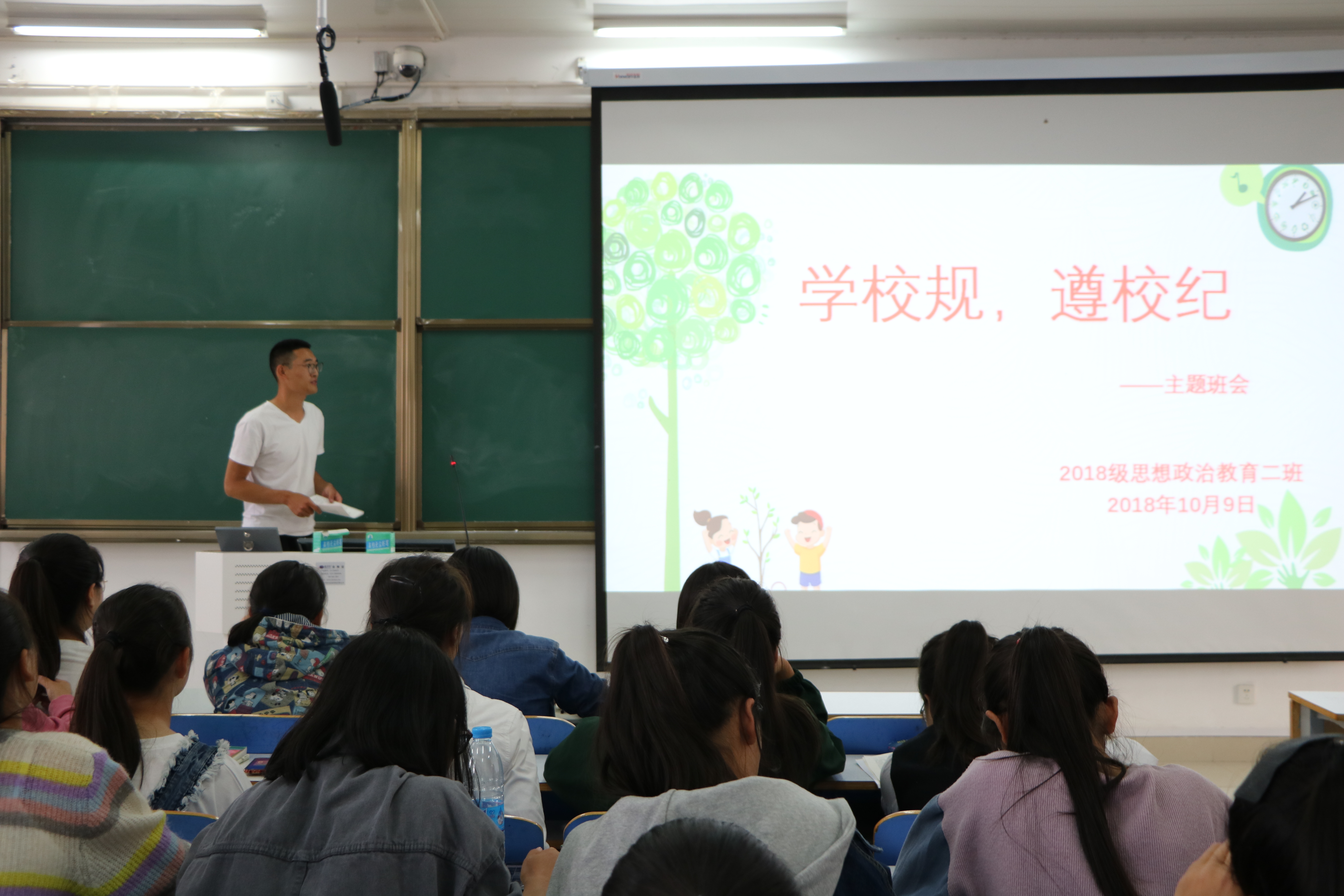 为引导我院新生严格遵循校规校纪,自觉规范个人行为,10月9日上午,我院2018级思想政治教育二班在社科楼514教室召开“学校规,遵校纪”主题班会。2018级思想政治教育二班全体同学共同参加本次班会。班会由班长杨康主持。