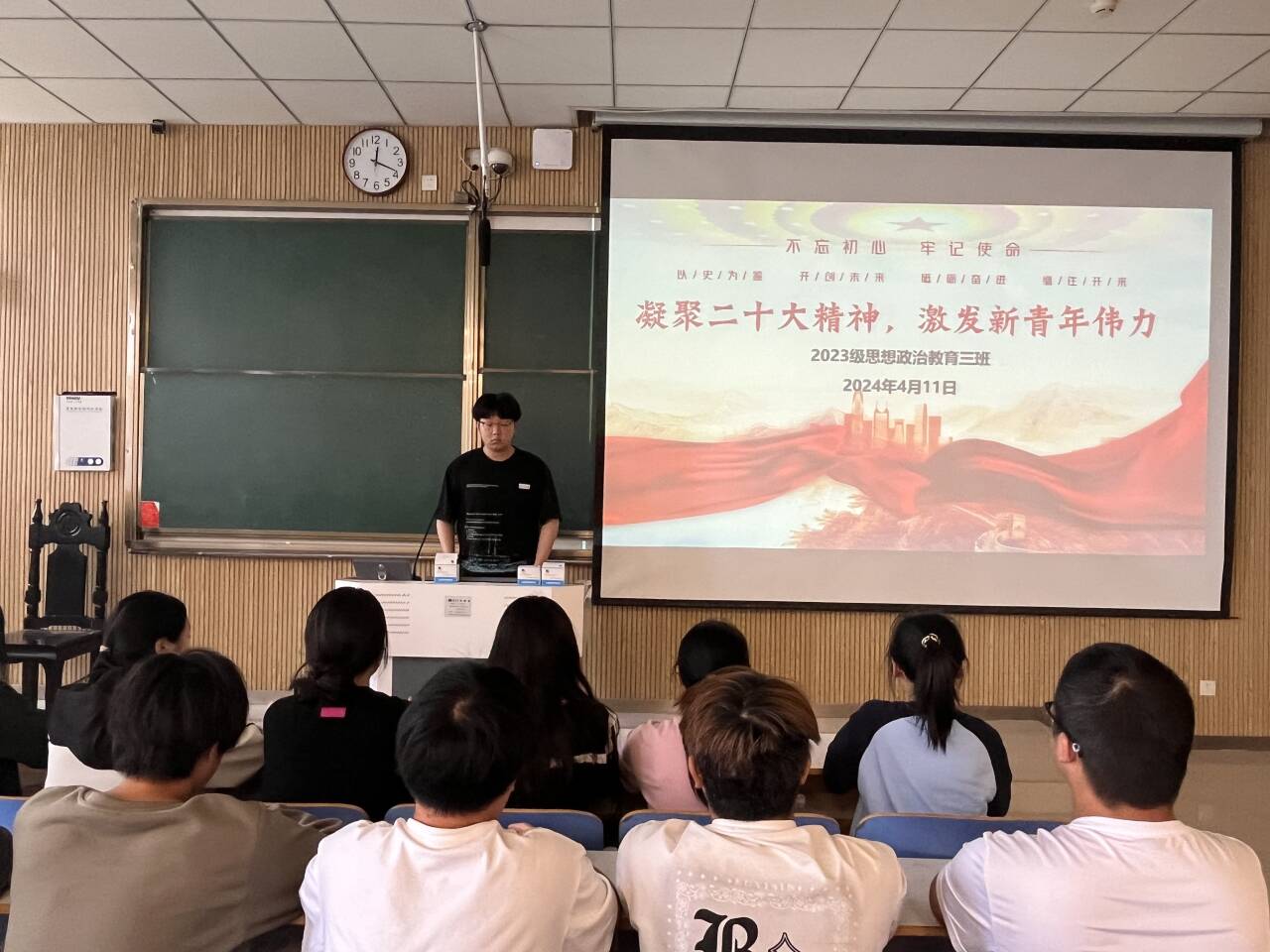 团课伊始,郝瀚以党的二十大精神网络思政课宣讲短视频为切入点,通过微视频播放,引导学生了解党的二十大在政治上、理论上、实践上所取得的一系列重大成果。他指出,只有全面、系统、深入学习,才能完整、准确、全面领会党的二十大精神,把党的二十大提出的目标任务落到实处。学生代表周芷薇发言,她表示,作为朝气蓬勃的青少年,我们要奋力拼搏、勇于追梦、力争有为,做到不忘初心,紧跟党走,以更好的成绩向党的二十大献礼。最后,郝瀚做出总结,他强调,我班学子应自觉用党的二十大精神统一思想和行动,心往一处想、劲往一处使,以习近平新时代中国特色社会主义思想为指引,坚定不移地听党话、跟党走。