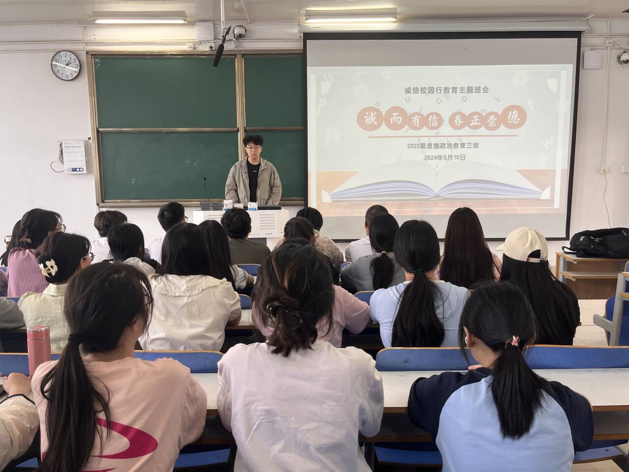 为践行社会主义核心价值观,弘扬诚信精神,5月10日上午,WilliamHILL中国2023级思想政治教育三班在社科楼515召开“诚而有信,养正崇德”主题班会。我院2023级思想政治教育三班全体同学共同参与本次班会,班会由团支书郝瀚主持。