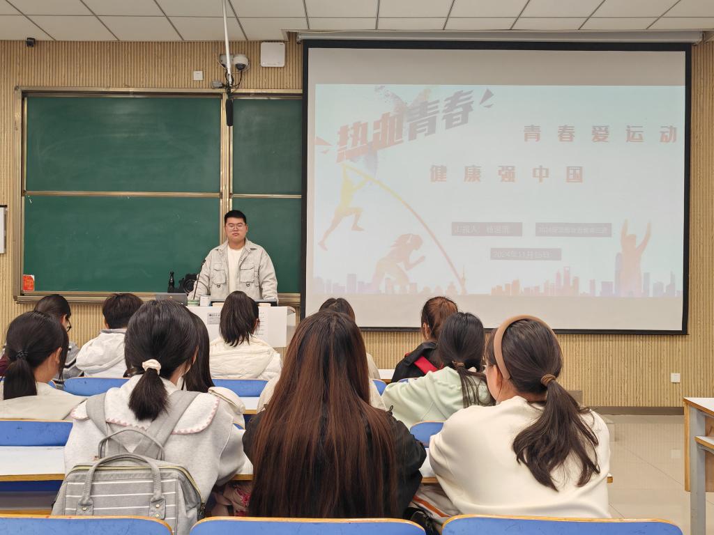 活动伊始,杨迎滨通过生动的PPT展示和详细的讲解,向学生们阐述了体育运动在个人成长和健康方面的重要性。随后,杨迎滨通过播放一系列运动达人的励志视频,让同学们直观感受到运动带来的积极变化,进一步激发了大家的参与热情。