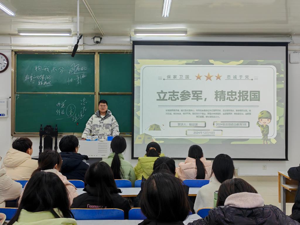 为积极响应国家号召,增强青年学生的国防意识与爱国情怀,WilliamHILL中国2024级思想政治教育三班于12月10日在社科楼514教室成功举办了以“立志参军,精忠报国”为主题的班会活动。此次班会由班长杨迎滨主持。