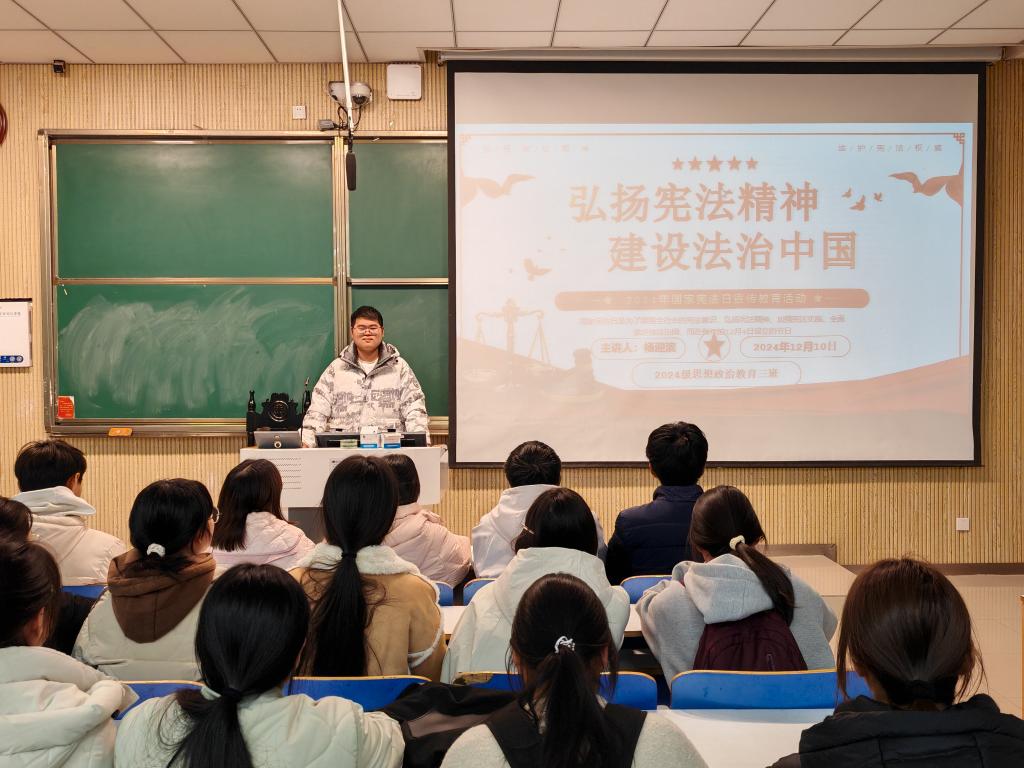 活动伊始,杨迎滨通过精心制作的ppt向大家详细介绍了宪法的相关知识,强调了宪法作为国家的根本法,具有最高的法律地位、法律权威和法律效力,在推进社会主义法制国家建设进程等方面发挥了重要作用。为了让同学们更直观地感受宪法的力量,杨迎滨带领大家观看了中国宪法宣传片,使同学们对宪法的意义和价值有了更加深刻的领悟。