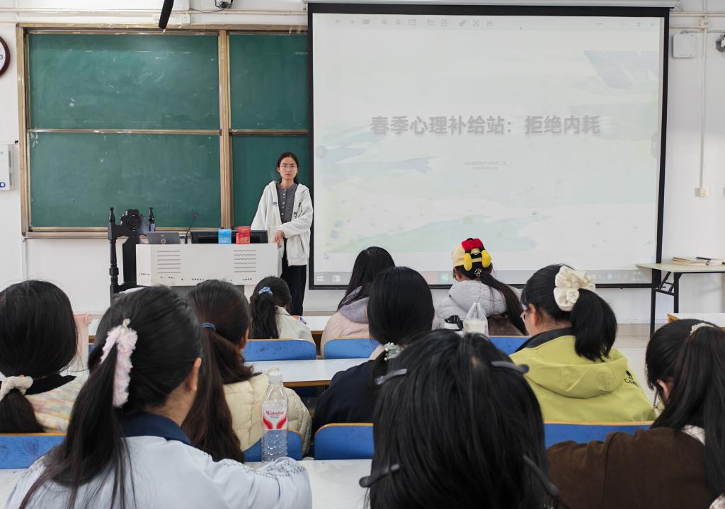 班会伊始,陈曦结合党的二十大报告关于“重视心理健康和精神卫生”的重要论述,阐述了心理健康对于思想政治教育专业学生的重要性。她表示,作为未来教育工作者,自身心理健康是践行师德的基础,学会应对“精神内耗”尤为关键。随后,陈曦通过案例分析,介绍了春季气温起伏、学业压力叠加易引发的情绪波动,剖析了“精神内耗”——过度自我怀疑、反复纠结、拖延疲惫等现象的表现与成因,帮助同学们科学认识情绪陷阱。在互动体验环节,陈曦带领同学们进行呼吸训练与情绪书写实践,引导大家合理梳理情绪。交流讨论环节,同学们围绕“如何在日常学习生活中拒绝内耗”展开分享,结合自身经历交流减压心得,在集体交流中释放压力、袒露心声。班会最后,陈曦号召大家将所学方法融入日常,营造关注心理健康的班级氛围,在互帮互助中增强心理韧性,为未来成长为一名合格的教师筑牢身心基石。