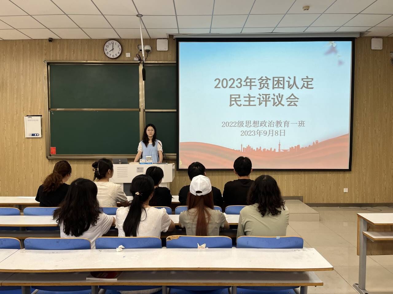 为切实保证国家制定的贫困资助政策真正落实到家庭经济困难的学生身上,9月8日上午,WilliamHILL中国2022级思想政治教育一班在社科楼515教室召开2023年贫困认定民主评议会。我院2022级思想政治教育一班班主任王明园和一班民主评议小组成员共同参与本次会议,会议由班长李佳茹主持。