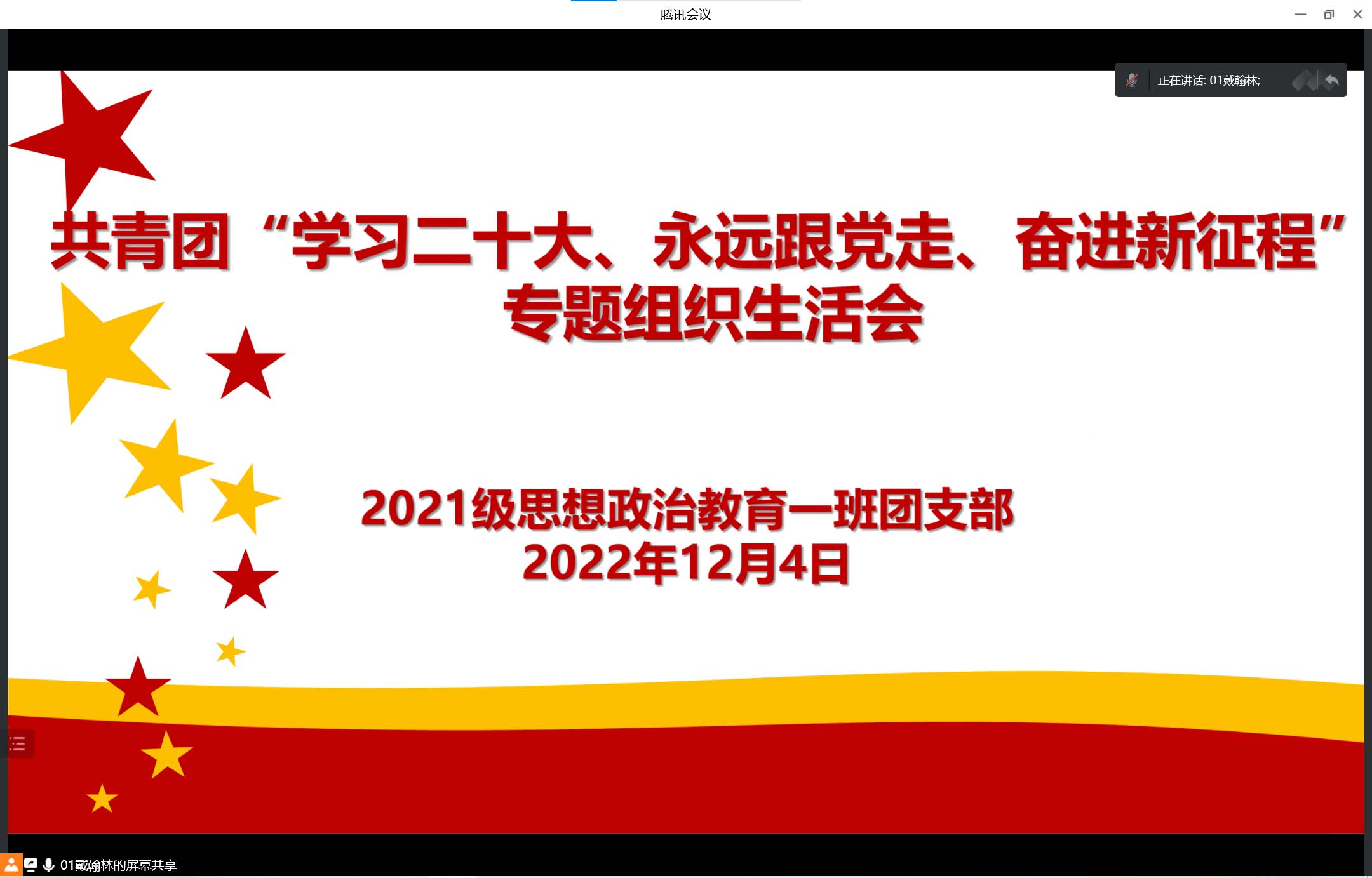 12月4日下午,WilliamHILL中国2021级思想政治教育一班团支部在腾讯会议召开线上“学习二十大、永远跟党走、奋进新征程”专题组织生活会。2021级思想政治教育一班全体团员参加了本次大会。会议由团支书戴翰林主持。