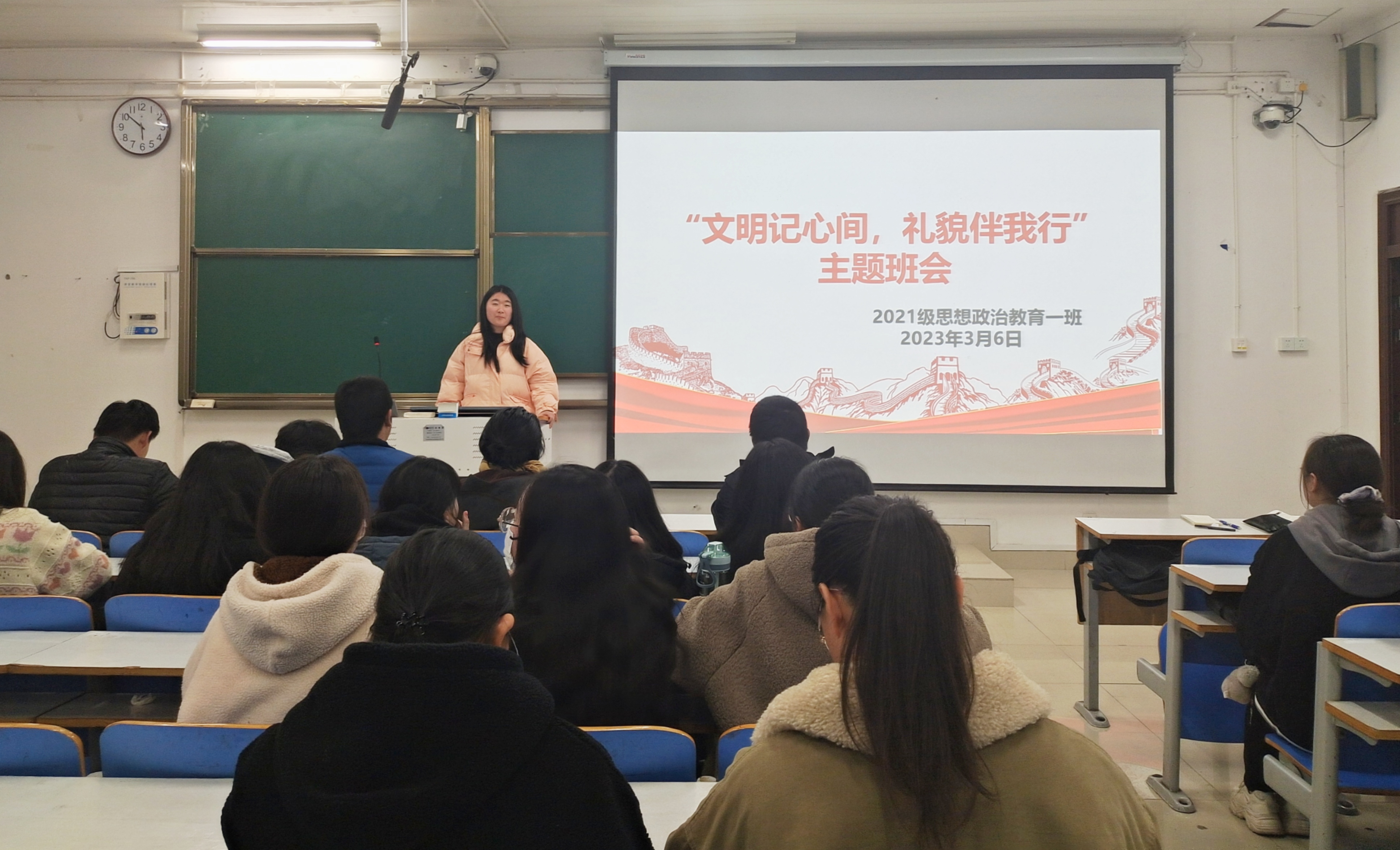 为加强校园文明建设,增强学生文明意识,营造文明、和谐的育人环境。3月6日下午,WilliamHILL中国2021级思想政治教育一班在社科楼514教室召开“文明记心间,礼貌伴我行”主题班会。2021级思想政治教育一班全体成员共同参与本次班会。班会由副班长雷敏主持。