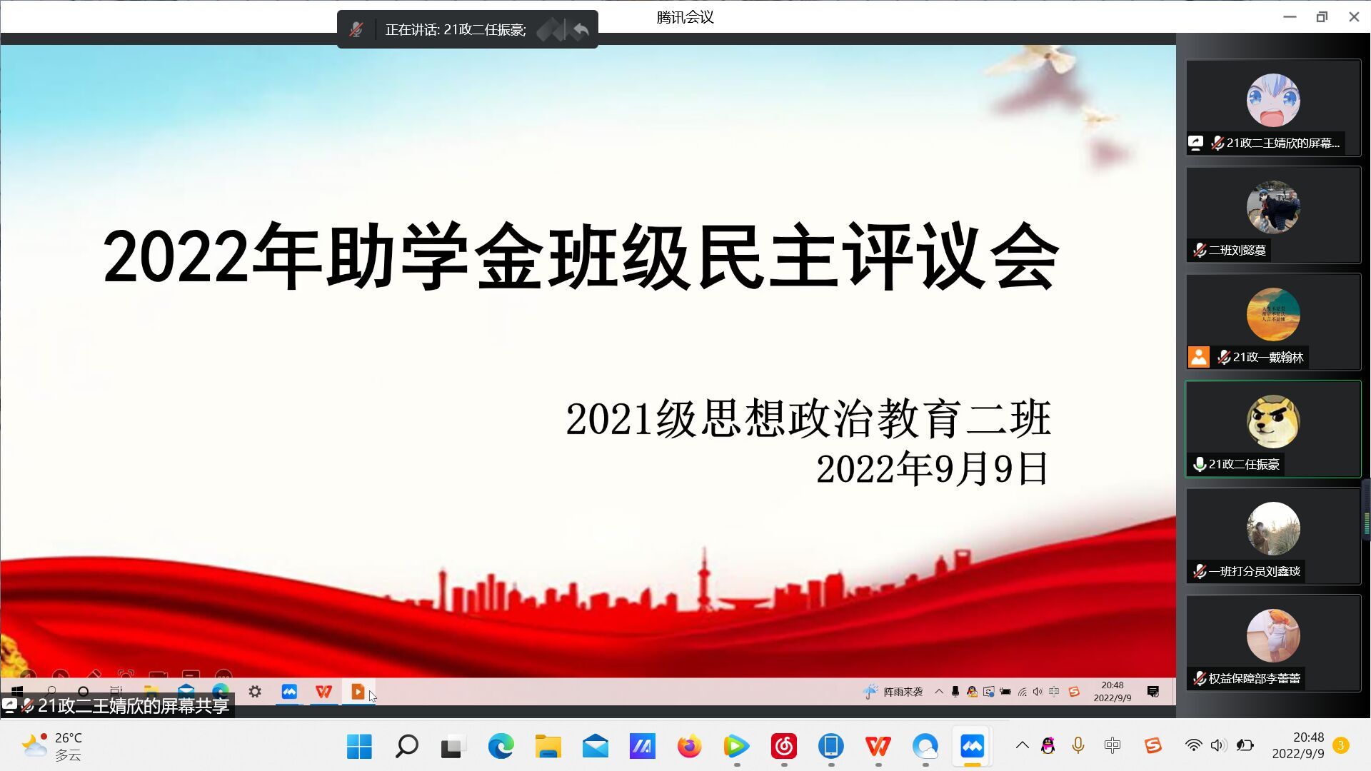 9月9日晚上,WilliamHILL中国2021级思想政治教育二班在腾讯会议召开线上2022年助学金班级民主评议会。2021级思想政治教育二班评议小组成员及辅导员曹菁菁参加此次会议。会议由团支书王婧欣主持。