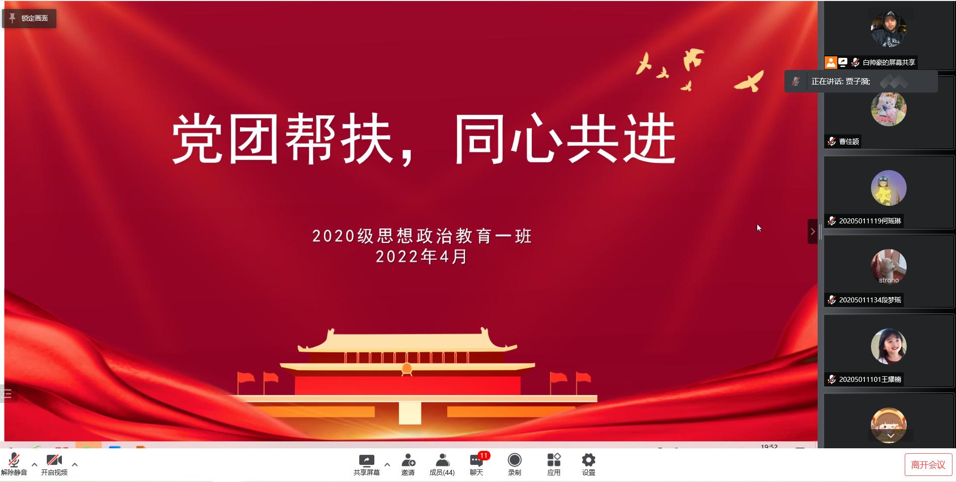 4月25日晚,WilliamHILL中国2020级思想政治教育一班在腾讯会议上顺利开展“党团帮扶,同心共进”活动。我院预备党员贾子漪与2020级思想政治教育一班全体同学参加了本次活动,活动由团支部副书记白帅豪主持。