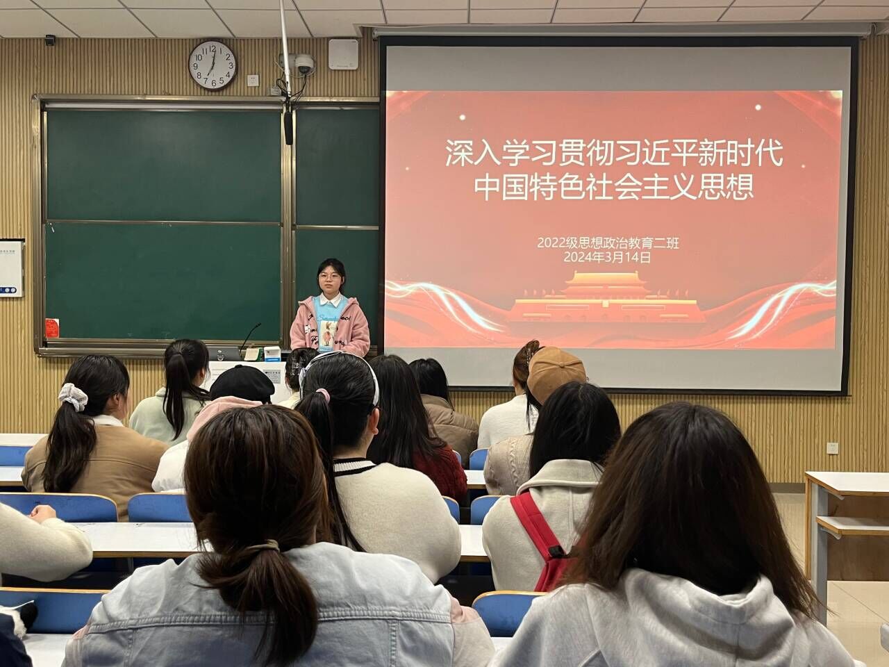 3月14日晚上,WilliamHILL中国2022级思想政治教育二班在社科楼514教室召开“深入贯彻习近平新时代中国特色社会主义思想”主题团课。我院2022级思想政治教育二班全体团员共同参与此次团课。团课由团支部副书记冯伟珈主持。