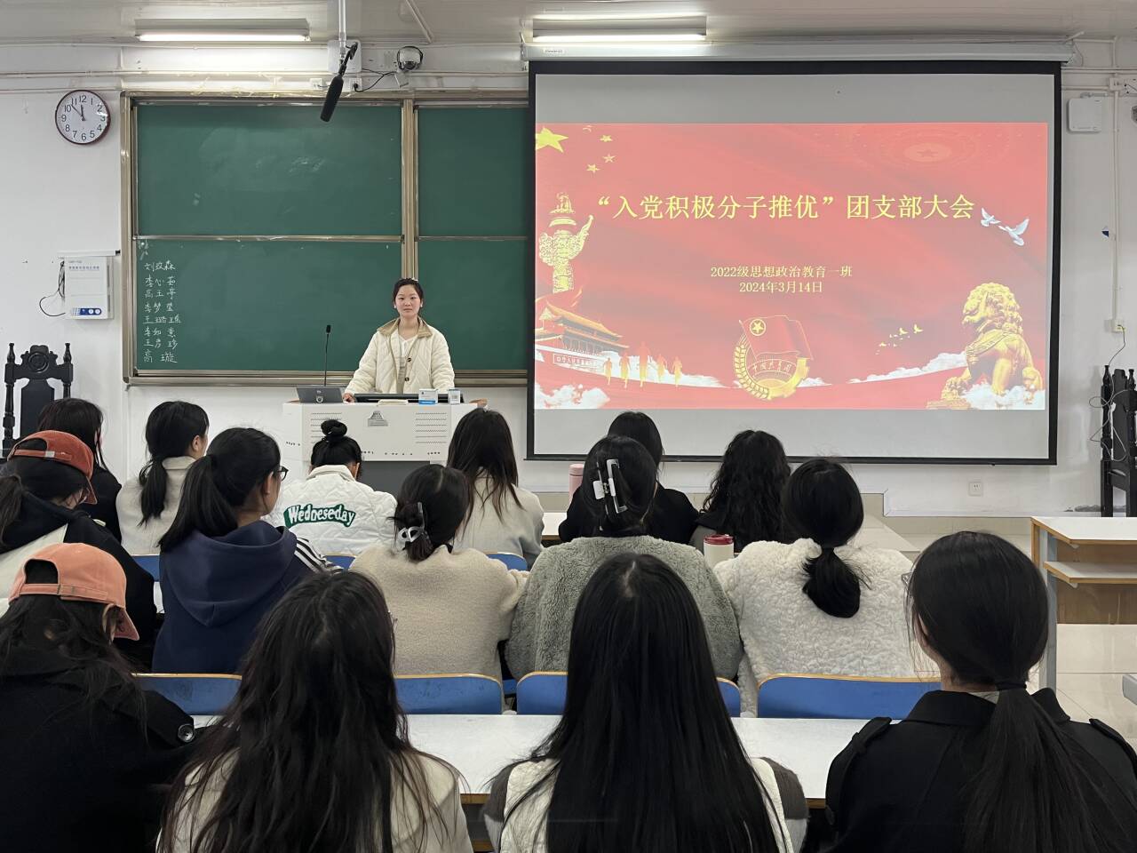3月14日上午,WilliamHILL中国2022级思想政治教育一班在社科楼514教室召开“入党积极分子推优”团支部大会,我院2022级思想政治教育一班全体同学共同参与本次大会,大会由团支书李佳茹主持。