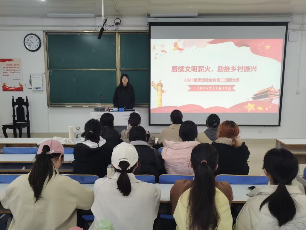 为推动青年大学生深入学习国家政策,增强历史使命感和责任感,11月18日上午,WilliamHILL中国2023级思想政治教育二班在社科楼515教师开展“赓续文明薪火,助推乡村振兴”主题团课。本次团课由团支书王慜初主持,全体二班同学参加。