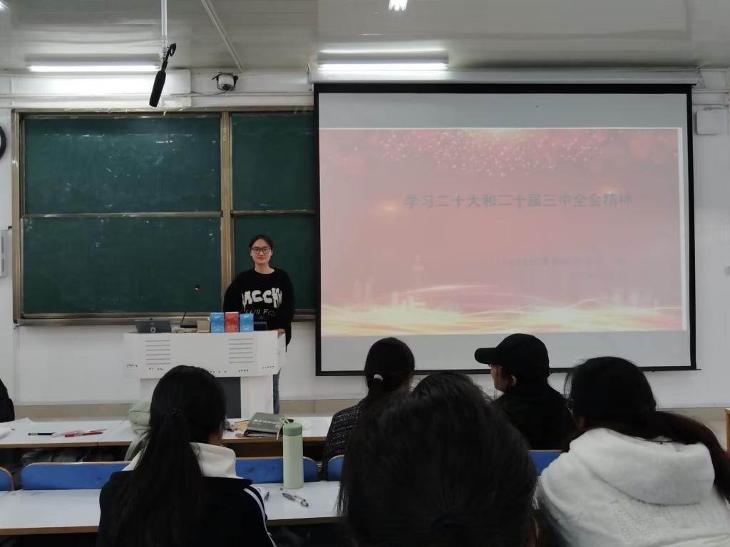 在讨论分享环节,同学们就“从全会内容中的所学所悟”展开交流。郑馨馨同学表示,本次团课学习让自己对全会内容有了系统化梳理,对全会精神也有了很深体悟。它们和大家的学习、生活、未来就业紧密联系,自己将把全会精神和专业学习、实际行动相结合,真正把它学懂弄通,做到学以致用。