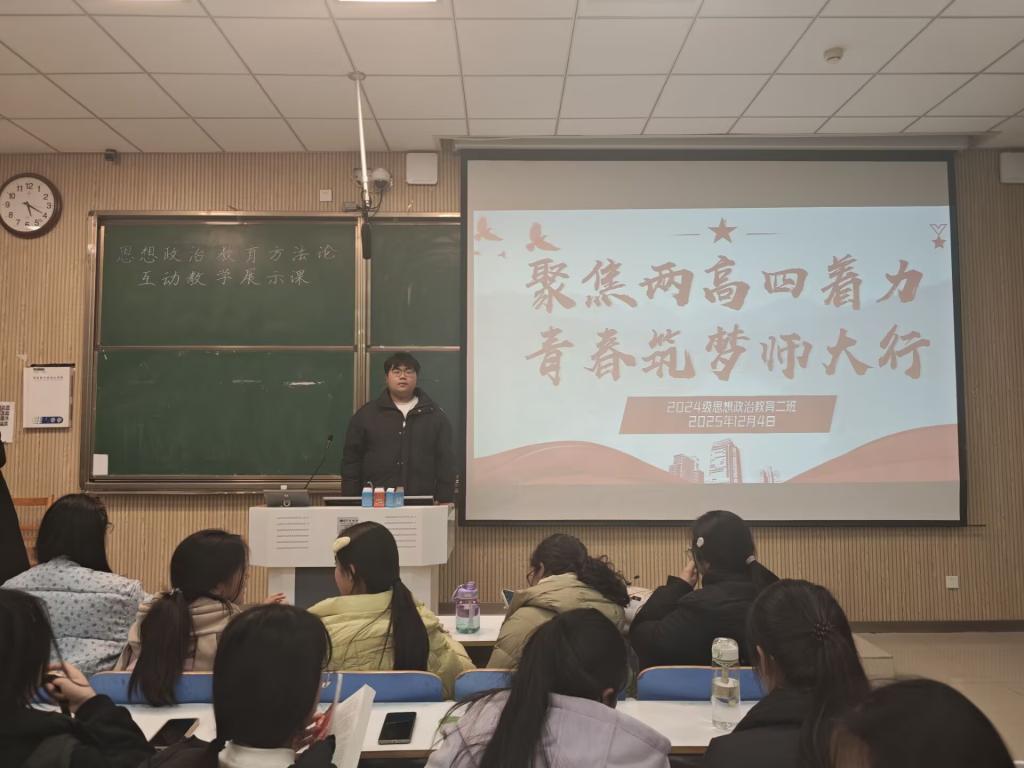 团课伊始,王志颖围绕“聚焦两高四着力”的内涵进行了简要解读,结合学校发展实际,介绍了相关理念在人才培养、学科建设和校园发展中的重要意义。他指出,“两高四着力”既是学校推进高质量发展的重要抓手,也为青年学生明确了努力方向。同学们应主动将个人成长融入学校和时代的发展进程中,在实践中不断提升自身能力。随后,班会通过案例分享的方式,展示了师大学子在科研创新、志愿服务、社会实践等方面的积极作为,生动体现了青年力量在学校建设和社会发展中的实际贡献。通过具体事例,同学们更加直观地感受到“青春筑梦”的现实路径。