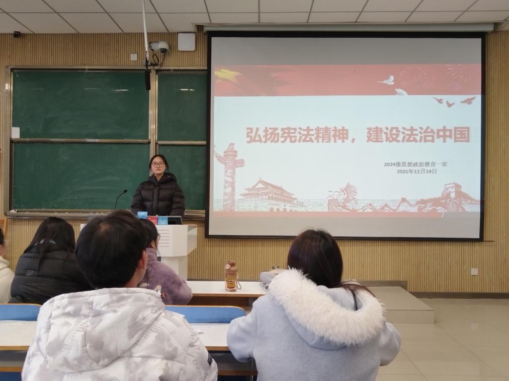 团课以“宪法的核心要义与青年的法治责任”为切入点,李冉通过PPT讲解、宪法条文解读、法治案例分析等形式,带领同学们回顾了我国宪法的发展历程,并从“理论知识”和“实践践行”两个维度刨析了“弘扬宪法精神”的时代内涵。接着,李冉组织了“宪法知识快速问答”与“宪法主题演讲”两个小活动来增强同学们的学习效果,鼓励同学们将宪法理论知识与社会法治实践相结合,能结合思政专业视角解读法治现象,让宪法精神融入日常学习和生活。随后,在交流分享环节,同学们纷纷结合自身经历积极探讨本次团课收获。其中,马奔同学表示,自己在高中时在学校的组织下去了当地法院进行参观学习,那次的所见所学给自己留下了很深的印象,今天的主题团课使自己对宪法知识有了系统和深入的学习,更意识到加强宪法对个人和社会的重要性,今后定会将宪法精神内化于心、外化于行,以青年力量助推法治中国建设。