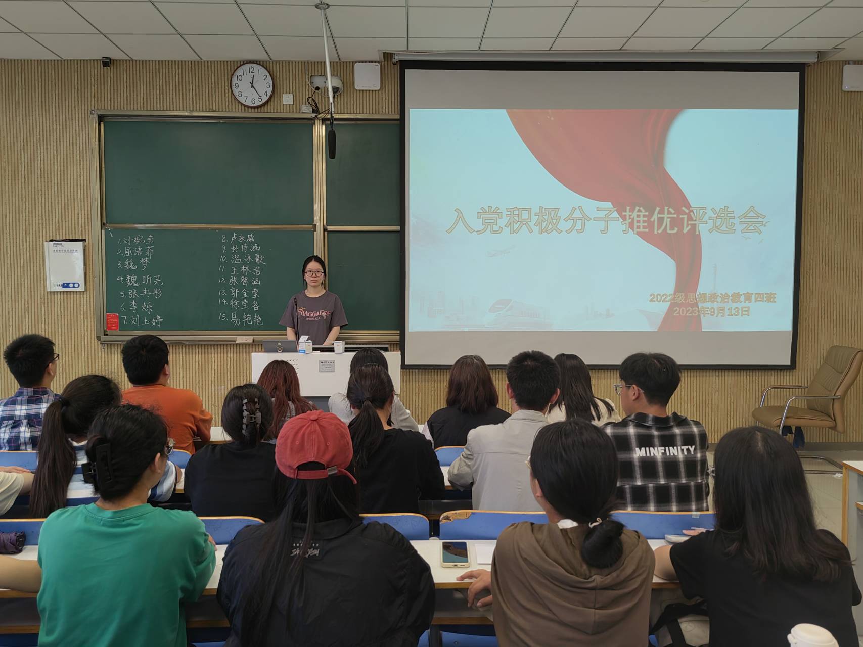 会议伊始,牛志杰对本次入党积极分子推优的流程进行了简要介绍,她表示,入党积极分子的选拔和培养是发展党员工作的源头性工作和基层党组织的重要工作。同学们在平时要积极学习党史,通过回顾党的光辉历程,希望大家可以坚定理想信念、忠诚履职尽责、勇于担当作为。然后,十六位参与入党积极分子唱票的同学依次上台发言竞选,他们发言结束后,除参与竞选同学外,全体成员进行了投票,随后由牛志杰进行当场唱票,确定了八名同学为入党积极分子候选。最后,周钰婷强调,作为肩负人民期待和时代重任的青年,在未来,同学们应进一步加强理论学习,勇挑时代重担,积极向党组织靠拢,严格要求自我,时刻为理想而努力。