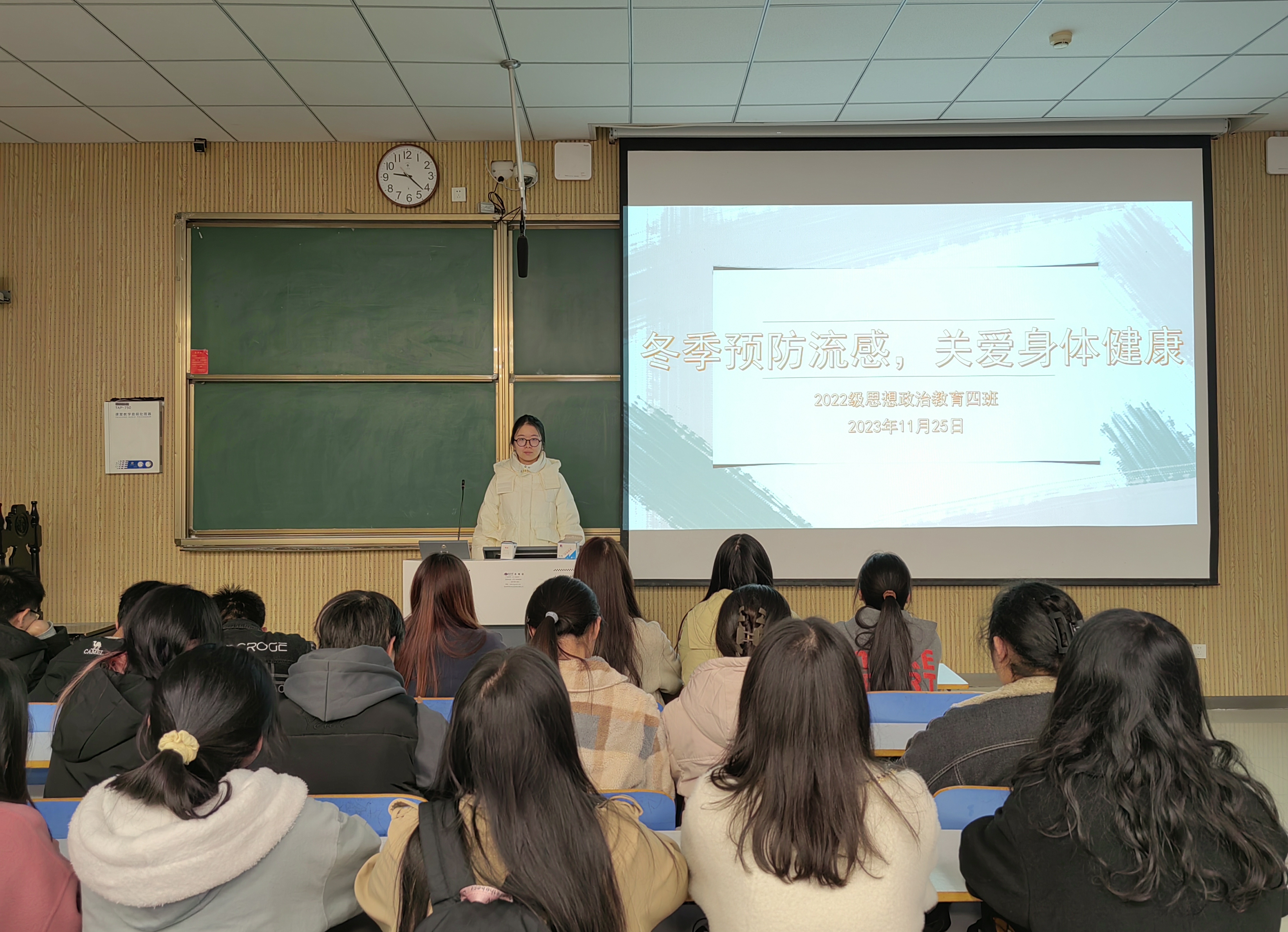 会议伊始,牛志杰通过幻灯片讲解的方式向大家介绍了流感的主要类型、临床表现、传播途径以及预防措施,使同学们充分认识到了有效防护、个人卫生、体育锻炼对预防流感的重要性。随后,牛志杰强调,流感已经处于冬季感染病毒的高峰期。她告诉大家流感是由流感病毒引起的一种病毒性急性呼吸道传染病,流行病学最显著特点为突然爆发、迅速扩散,造成不同程度的流行,具有季节性,发病率高但病死率低。最后,牛志杰从日常生活的小细节入手,向学生们普及了流感预防知识。她强调个人卫生是预防流感的关键,如不要随地吐痰、打喷嚏时捂住口鼻、勤洗手、保持室内通风等。同时,我们要养成良好的生活习惯,及时接种流感疫苗,加强体育锻炼、均衡饮食、保证充足的睡眠,以提高自身免疫力。
