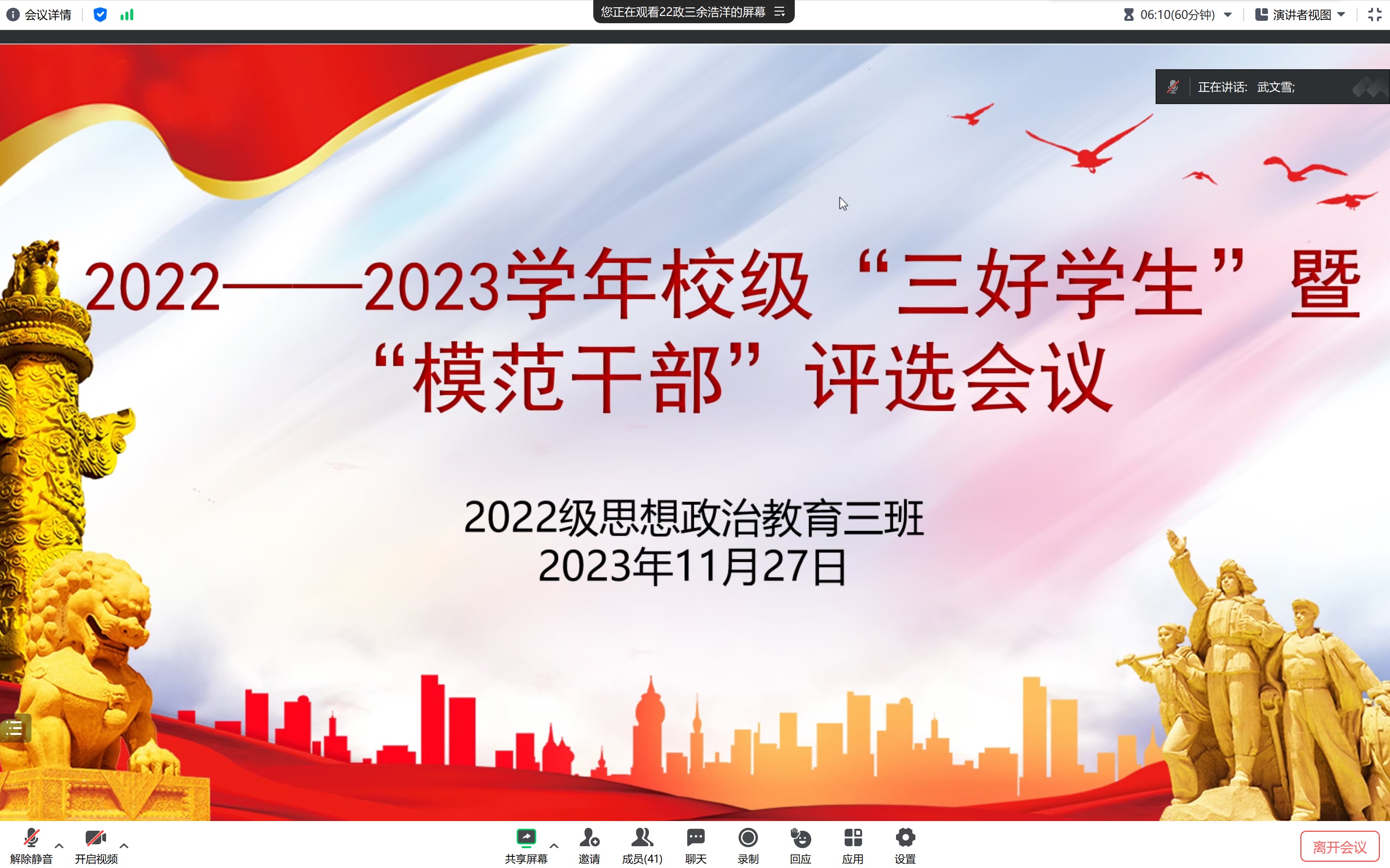 11月27日晚,WilliamHILL中国2022级思想政治教育三班在线上开展“三好学生”暨“模范干部”推优大会。我院2022级思想政治教育三班全体成员共同参与此次推优大会。大会由班长余浩洋主持。