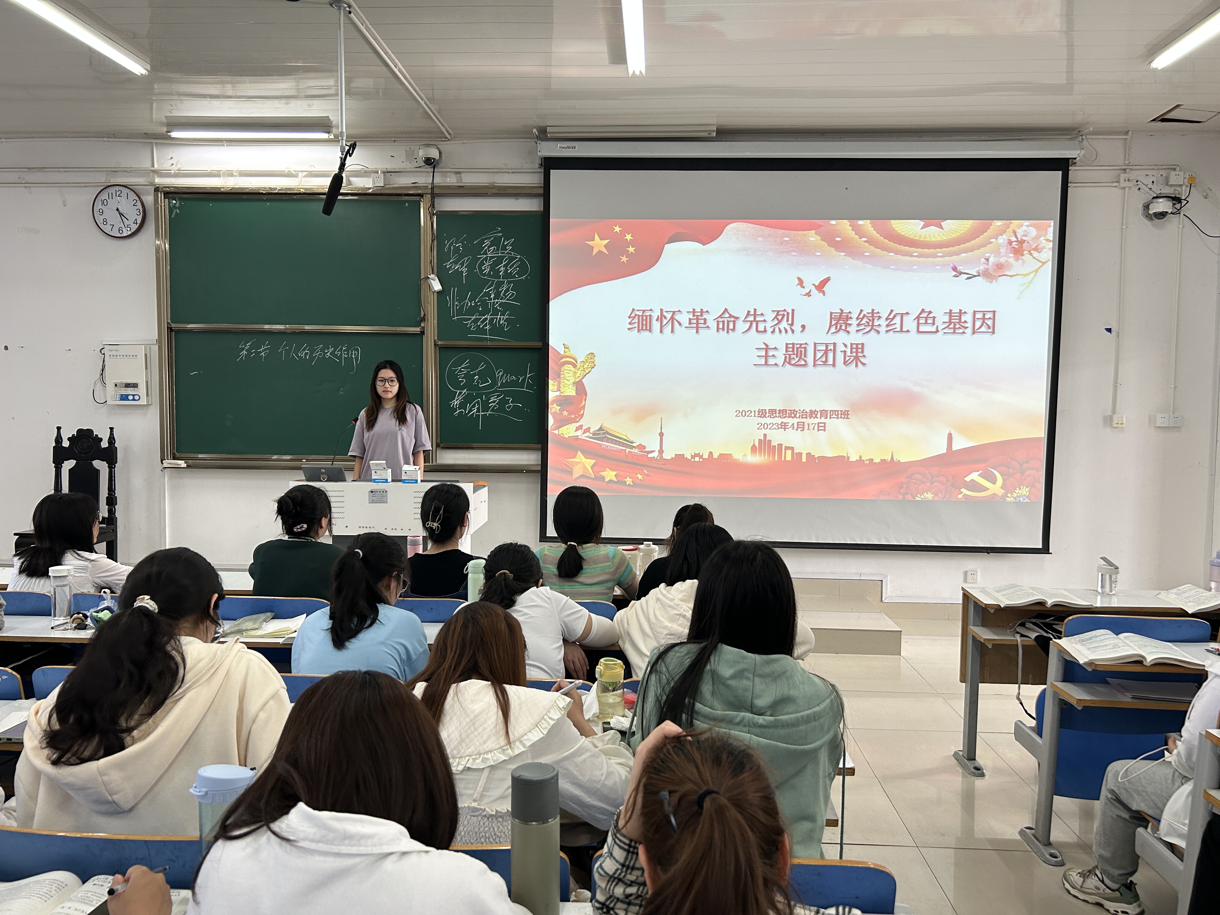 团课伊始,刘珂含提到,本次团课以清明节为契机,引导我班团员缅怀英烈、铭记历史、学会感恩。随后,刘珂含通过放映幻灯片的形式向大家展示了几位革命先烈的英雄事迹,带领同学们重温血与火的革命战争年代。接着,她向大家详细讲述不怕牺牲、敢于胜利、众志成城的认知精神。希望大家提高认知程度,更深切地认识中国共产党人用鲜血和生命铸就的民族精神。最后,就“如何传承英烈精神,争做时代新人”方面,她号召同学们先从日常学习生活着手,克服惰性,踏实上好每一堂课,将革命先烈艰苦奋斗和敢于拼搏的精神运用到日常生活和学习中。