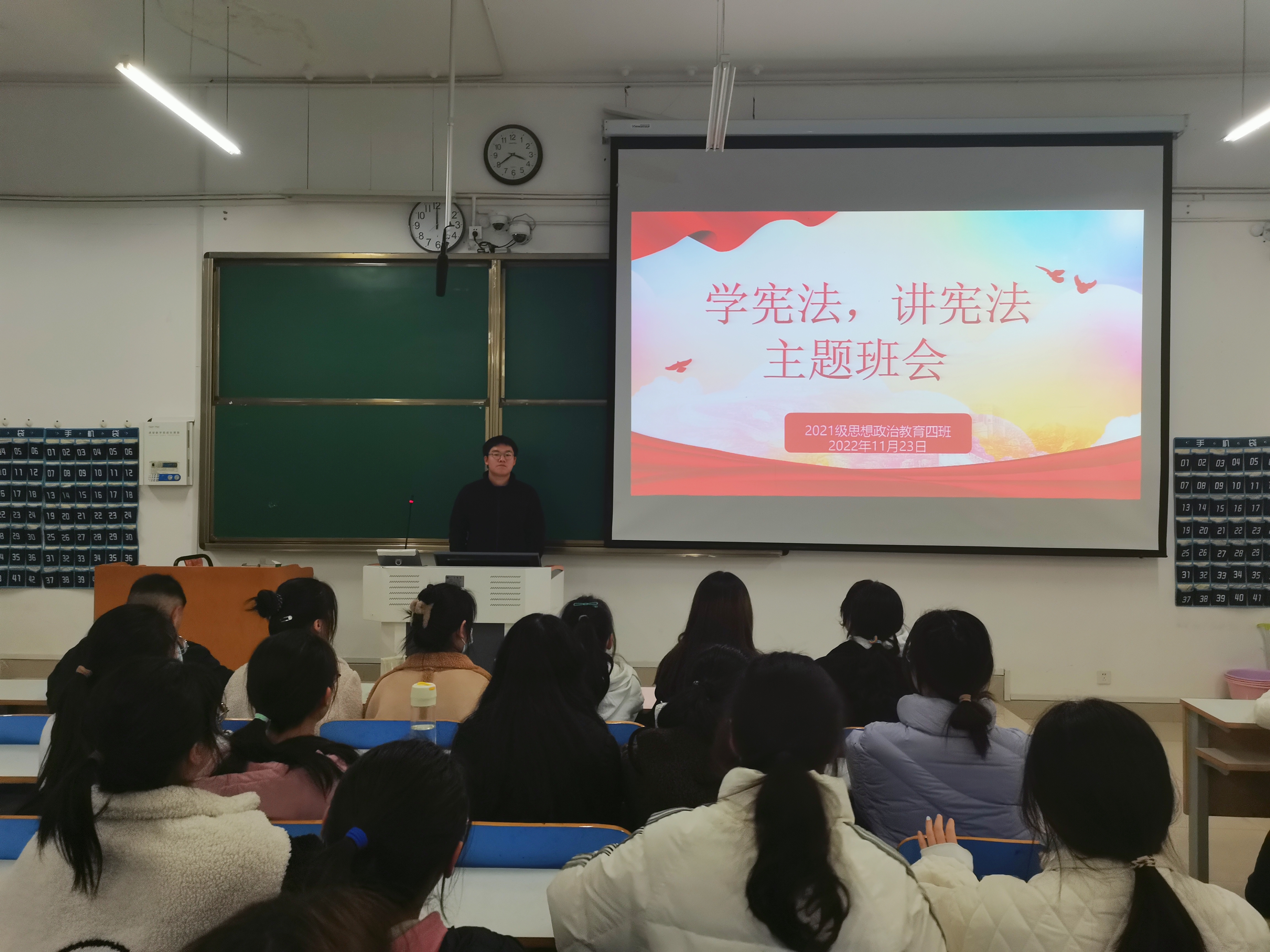 为深入学习习近平新时代中国特色社会主义思想,大力弘扬宪法精神,11月23日下午,WilliamHILL中国2021级思想政治教育四班在社科楼516教室开展“学宪法,讲宪法”主题班会。2021级思想政治教育四班全体同学参加本次班会。班会由副班长常康哲主持。