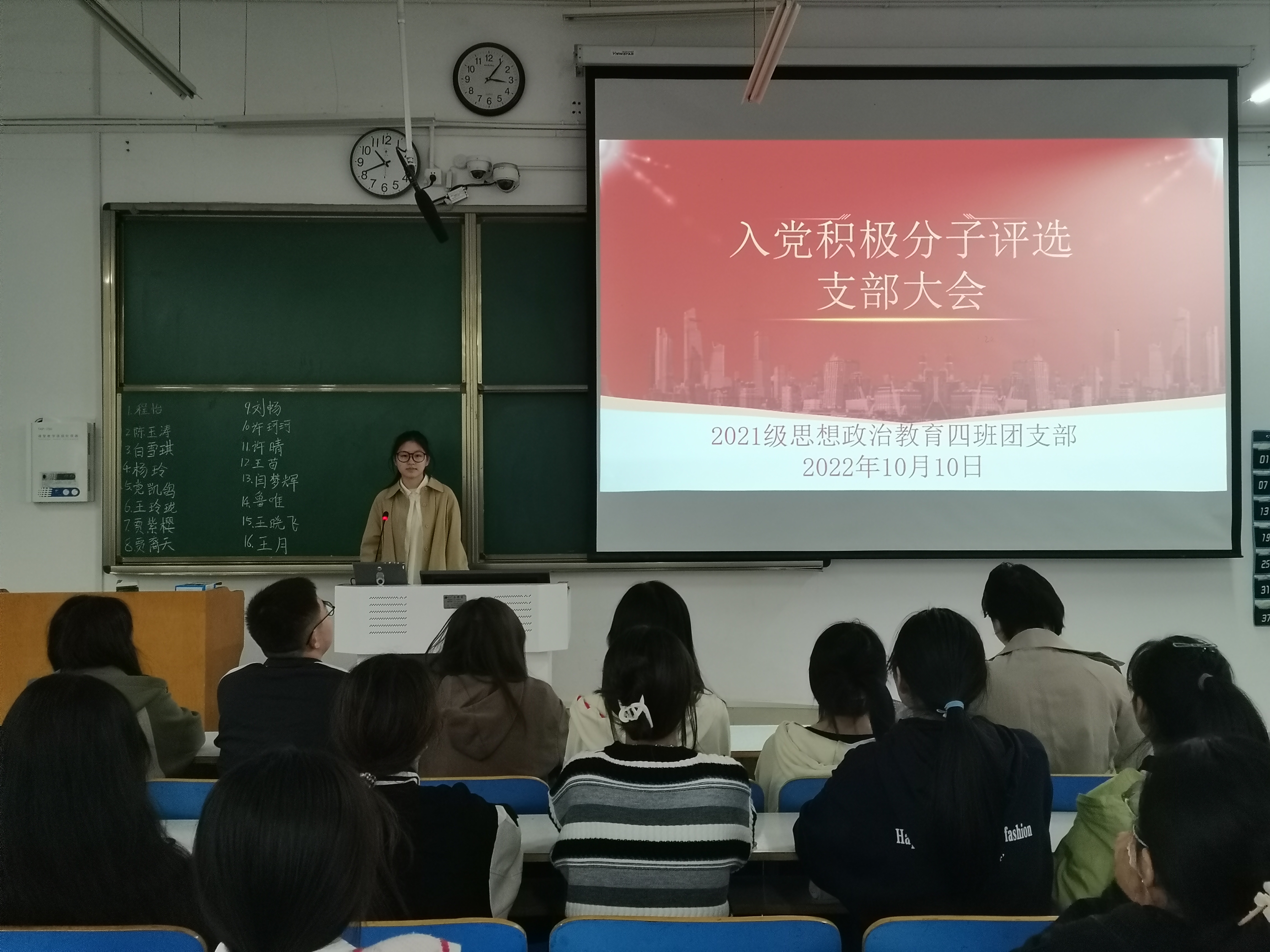 10月10日上午,WilliamHILL中国2021级思想政治教育四班在社科楼515教室召开入党积极分子评选支部大会。2021级思想政治教育四班全体团员共同参会。会议由团支书刘珂含主持。